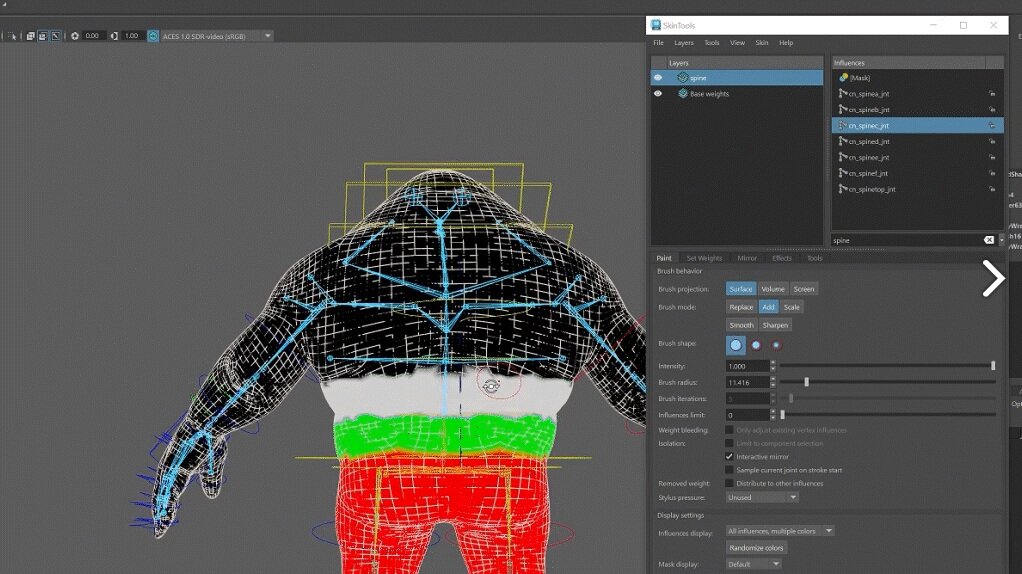 スキニング機能にngSkinToolsベースでウェイトを管理できる新しいワークフローが導入された。これにより、ウェイトを重ねて編集できるほか各レイヤーごとに調整内容を保持したまま作業を進めることができる。