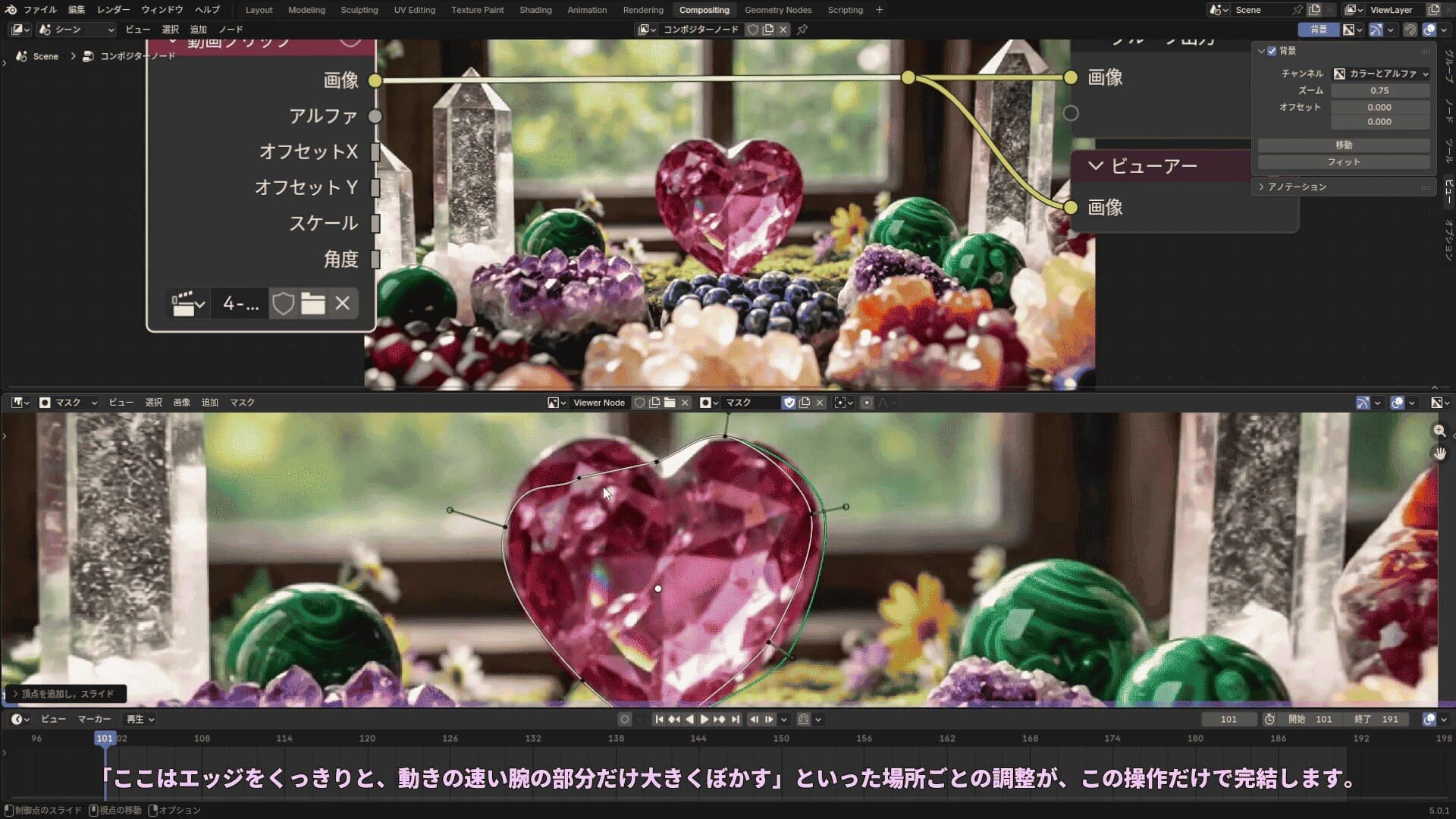 本講座では、Blenderのコンポジット機能を入門からプロフェッショナルレベルまで全25部構成で体系的に解説します。色調補正やカラーグレーディングといった基礎から、NPR表現、マルチパスコンポジット(AOV)、クロマキー合成、深度情報を活用した空間合成、ベクターブラーによる動きの表現はもちろん、コンポジターの全ノードカテゴリ(フィルター、カラー、コンバーター、マット、入力、出力)を網羅的にカバー。さらにVSE(ビデオシーケンスエディター)の基礎からエフェクト活用、カラーマネジメントと最適化まで、Blenderの映像制作パイプラインを完全に理解できる内容です。「なんとなくノードを繋いでいる」状態から脱却し、各ノードの役割とデータの流れを正しく理解することで、意図通りの映像表現をコントロールできる力を身につけていただきます。
