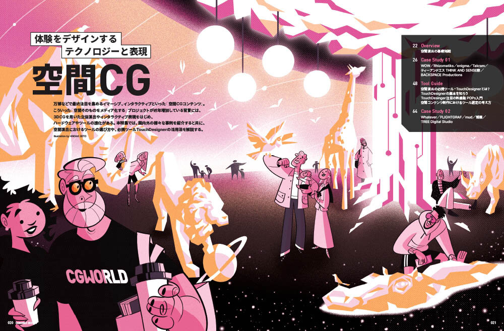 今月の特集は、「空間CG」! 万博などで最近注目を集めるイマーシブ、インタラクティブといった「空間CGコンテンツ」を、全58ページにわたって大特集します。