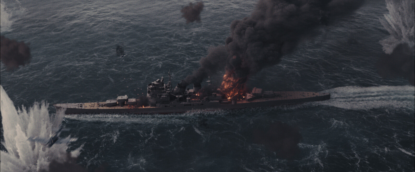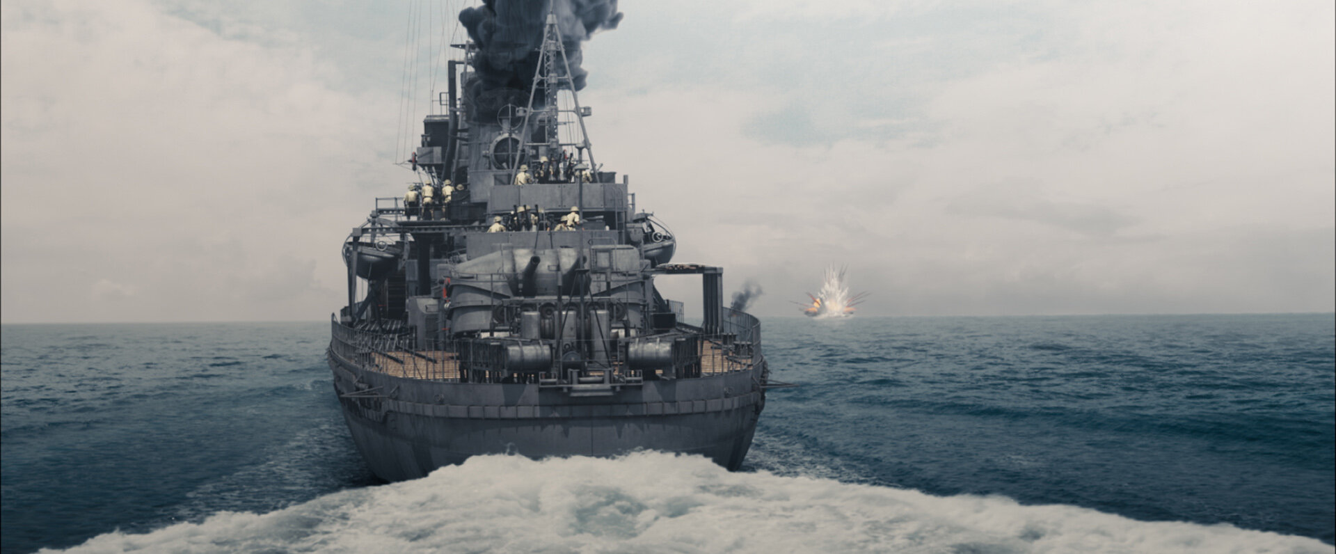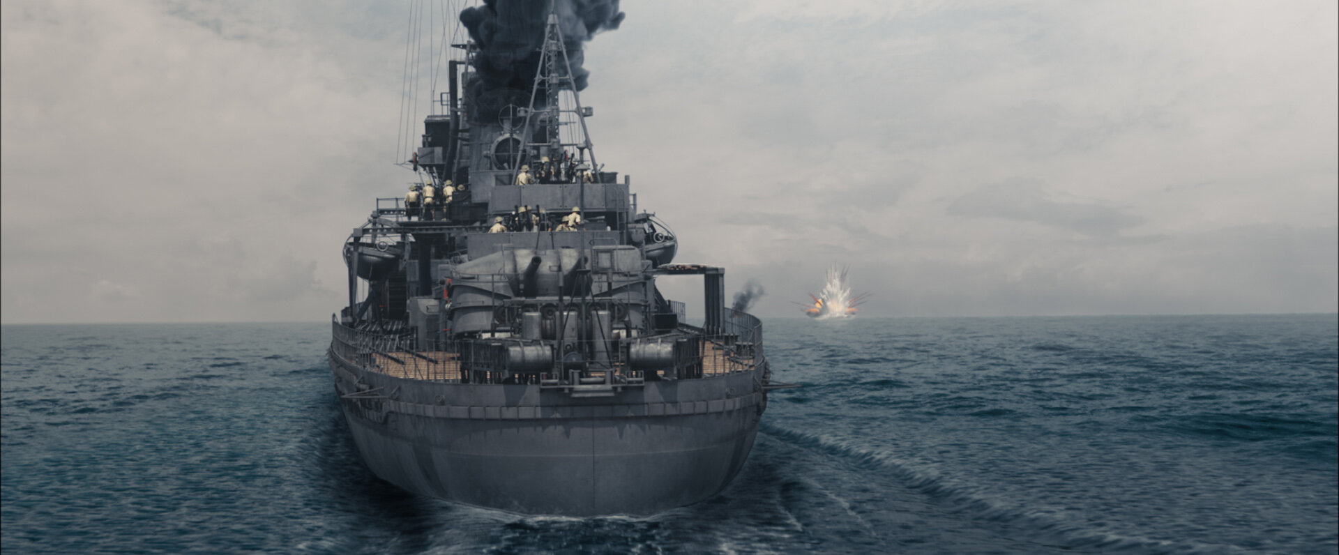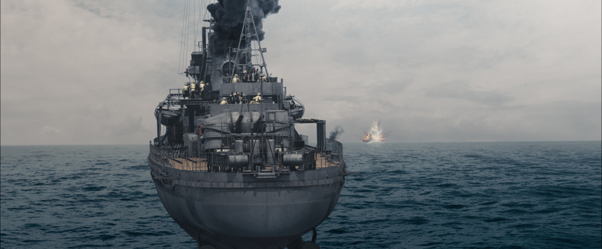 ▲ イメージ・ロジックが担当した、雪風が魚雷を発射する瞬間のアップショット。左上の画像は、実写プレート。それ以外は完成形の連番である。実写プレートには含まれていない、煙突や機銃台、兵士などをCGで追加し、艦上の密度や時代感が補完された。「当時のモノクロ資料映像をリファレンスに、魚雷の発射軌道を調整しました。特に発射直後の動きにこだわって、資料映像のぼやけたフィルム質感を参考にしつつ、実写プレートとのバランスをとった質感に仕上げています」(金元氏