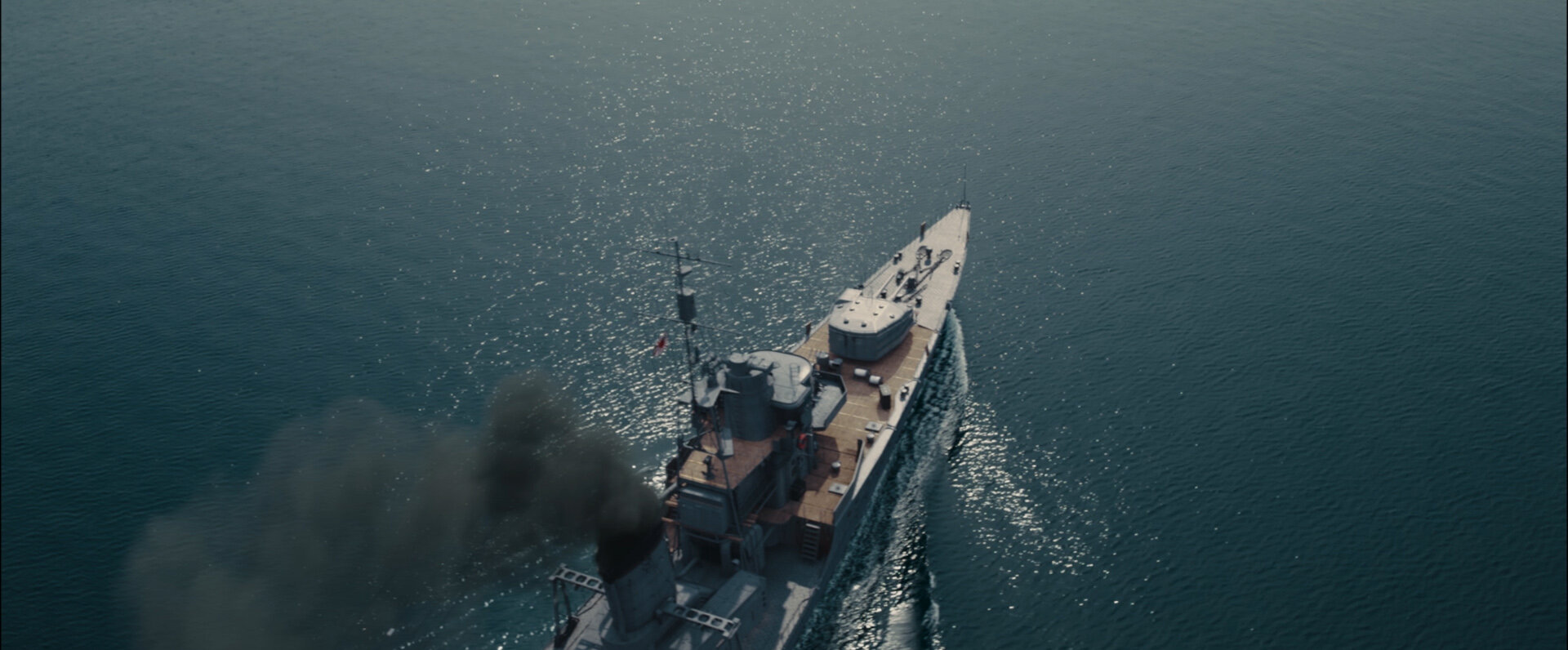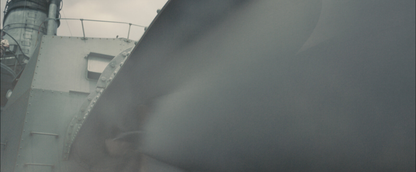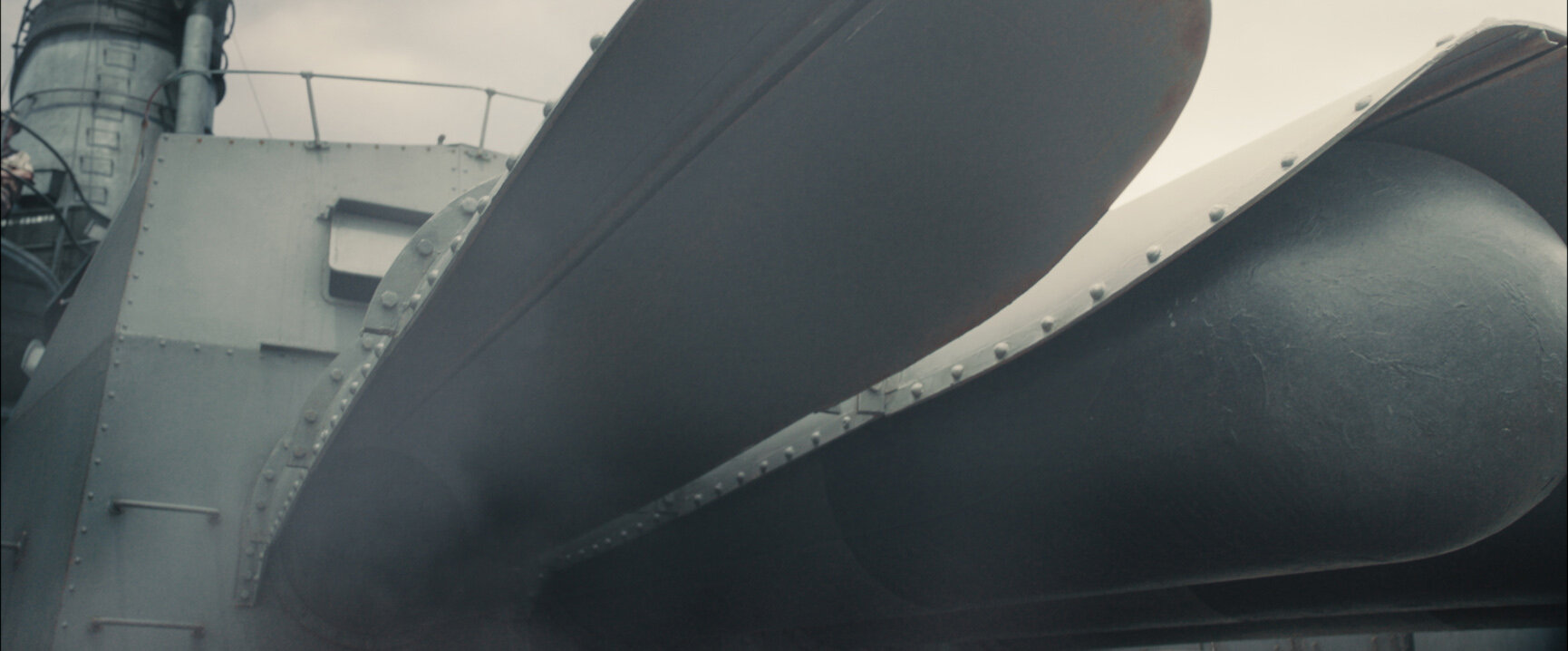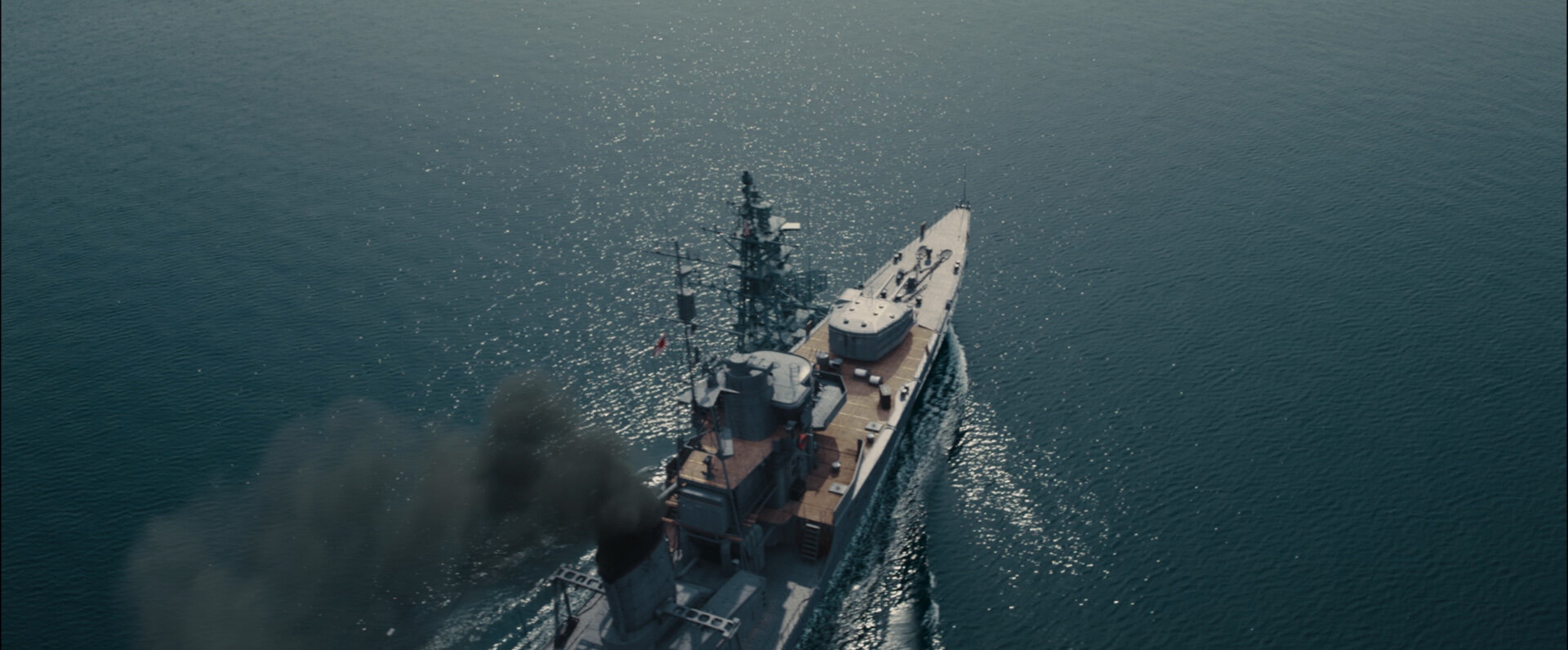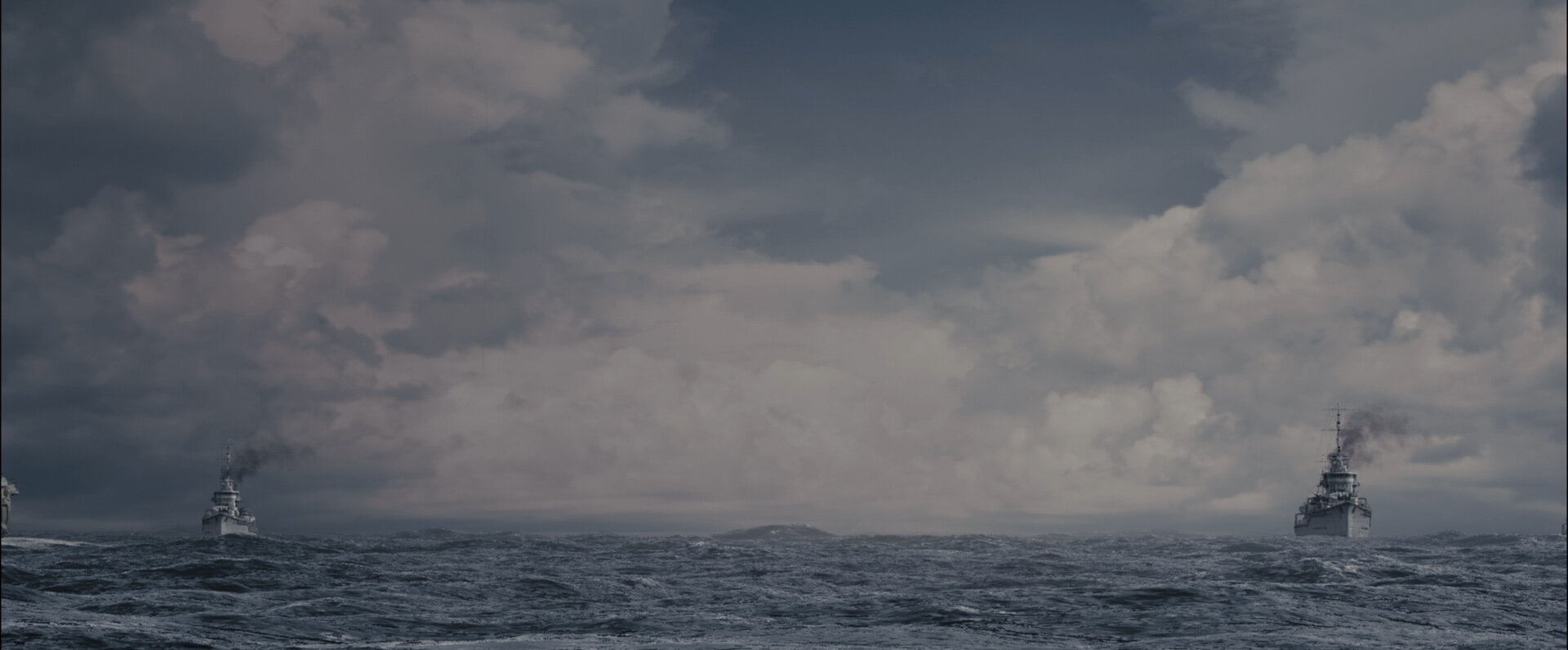 ▲ イメージ・ロジックが担当した、雪風が魚雷を発射する瞬間のアップショット。左上の画像は、実写プレート。それ以外は完成形の連番である。実写プレートには含まれていない、煙突や機銃台、兵士などをCGで追加し、艦上の密度や時代感が補完された。「当時のモノクロ資料映像をリファレンスに、魚雷の発射軌道を調整しました。特に発射直後の動きにこだわって、資料映像のぼやけたフィルム質感を参考にしつつ、実写プレートとのバランスをとった質感に仕上げています」(金元氏