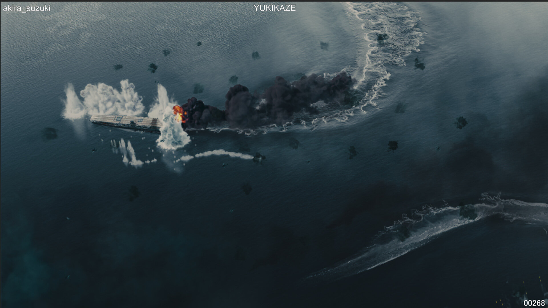 本作のVFXワークは、ナイス・デー、コラット、イメージ・ロジックの3社が中心となり行われた。さらに、メカモデラーの帆足タケヒコ氏、戦闘機のVFXに定評ある大畑智也氏、プリビズや特別なカットを担当した鈴木 朗氏といった百戦錬磨のベテランたちが参加。ハイディテールの艦船や複雑な流体シミュレーションなど、高負荷のVFXが中心のため、制作中の苦労は尽きなかったそうだが、これまでの経験を活かして確かなクオリティに仕上げることに成功した。