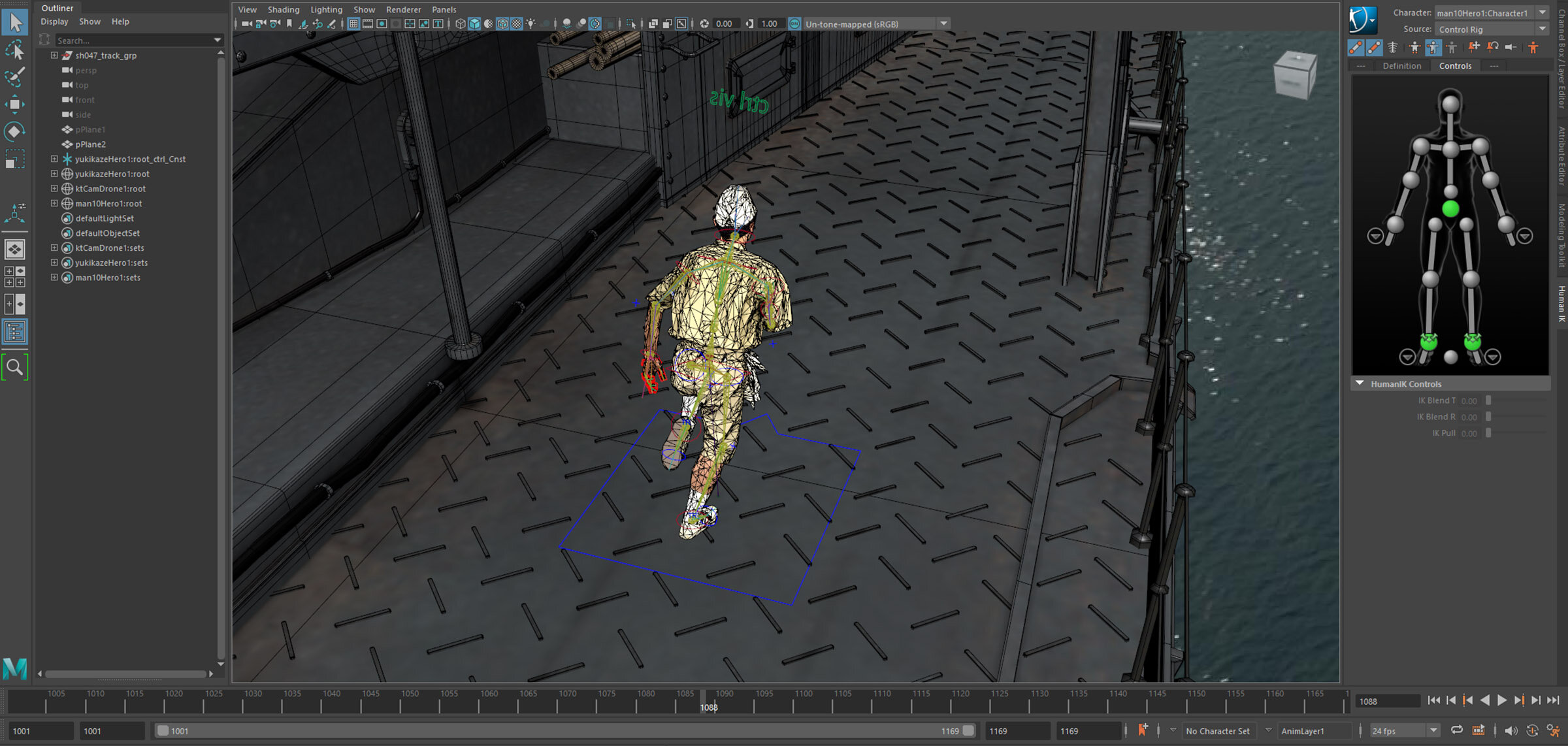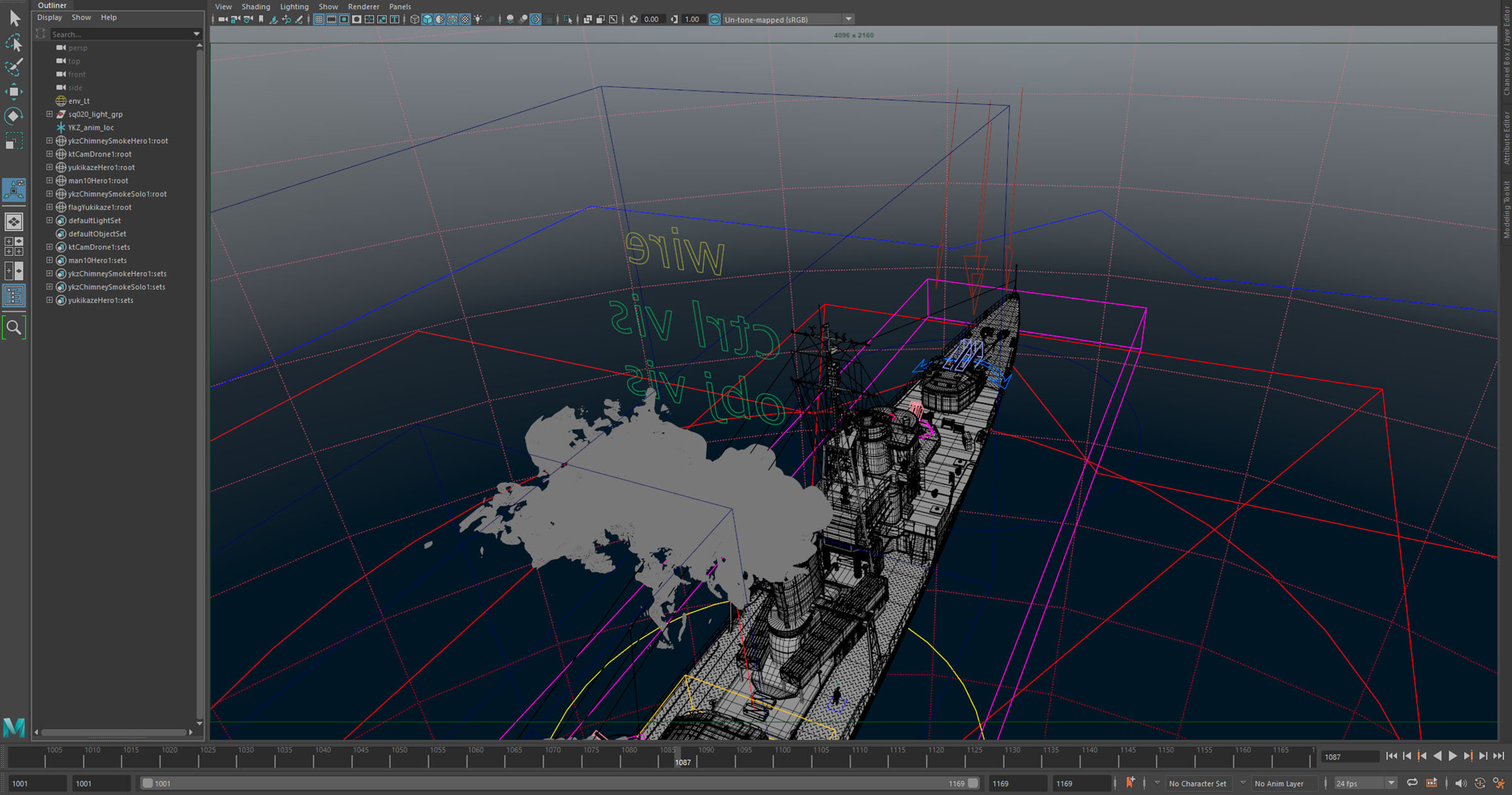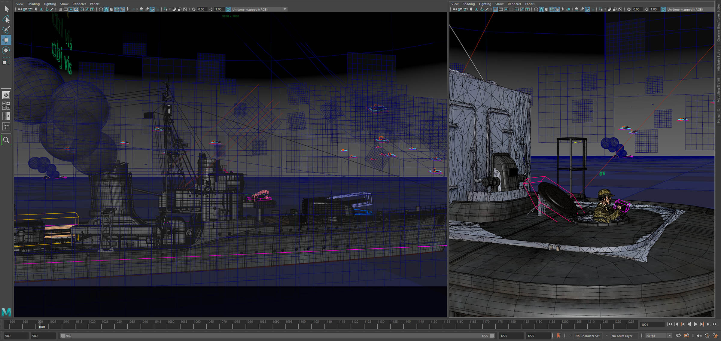 ショットワークは、ナイス・デーが全体の取りまとめを行いつつ、コラットとイメージ・ロジックの3社で分担したという。「フルCGなど、3DCG要素が多いものをコラットが担当。コンポジットワークが中心となるものをナイス・デー。そして、イメージ・ロジックには雪風の甲板上のシーンなど、セットエクステンションが必要になるショットや中盤のシーンを中心に担当してもらうという要領で分業しました。戦闘機のカットは、大畑さんにお願いしました。ベーシックなワークフローはコラットに構築してもらい、ショットを担当する会社やアーティストごとに、それぞれの強みを活かすかたちで使用ツールやつくり方をアレンジしています。少数精鋭でクオリティを高めるには、このような進め方が効果的なんですよ」(オダ氏)。