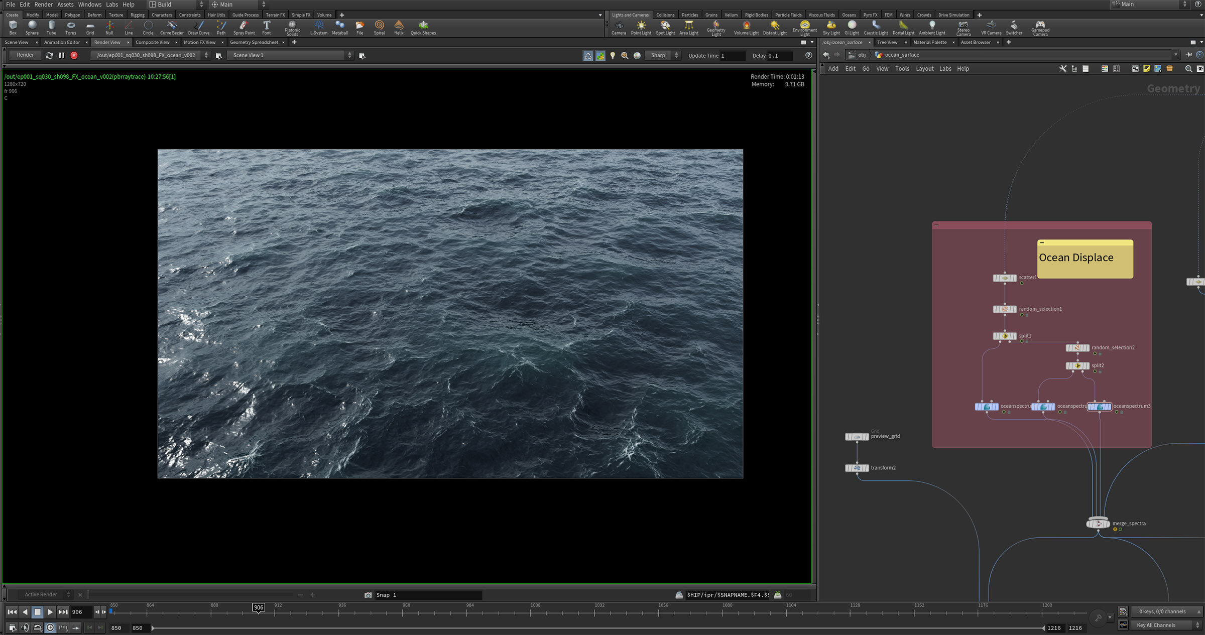 3DCGワークで難題となったのは、やはり海の表現だったという。「基本的にMayaでショットワークを行い、海や破壊などのFX作業をHoudiniで行いました。レンダラは、Arnoldを使いました。FXについては、Mantraでレンダリングしています。ここまで大物量の海をつくるのは初めてだったこともあり大変でした。レンダリングはメモリ量との戦いで、一度でレンダリングを回せないこともあったので、ローカルにキャッシュを取ったりしながら対応しました」と、山下潤一CGディレクター。