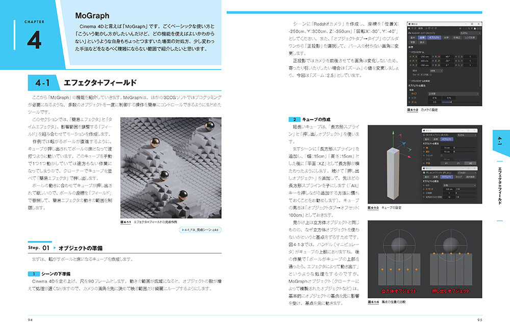 作例は「キーフレームアニメーション」「デフォーマ」「MoGraph」「ダイナミクス」などCinema 4Dの機能ごとに分類されており、それぞれの制作過程をステップごとに詳しく解説しています。作例ファイルは完成版だけでなく、途中経過も収録されているので遡って学習を進めることが可能です。