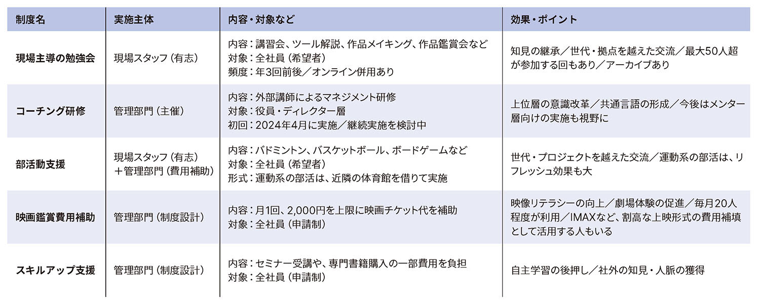 山岸:映画チケット代を会社が補助する制度もありますね。月1回、上限2,000円まで負担するしくみです。若手の中には、学生時代にあまり映画を観てこなかった人もいるので、映像制作に関わる者として「観る習慣」を育てるきっかけになればと思っています。
