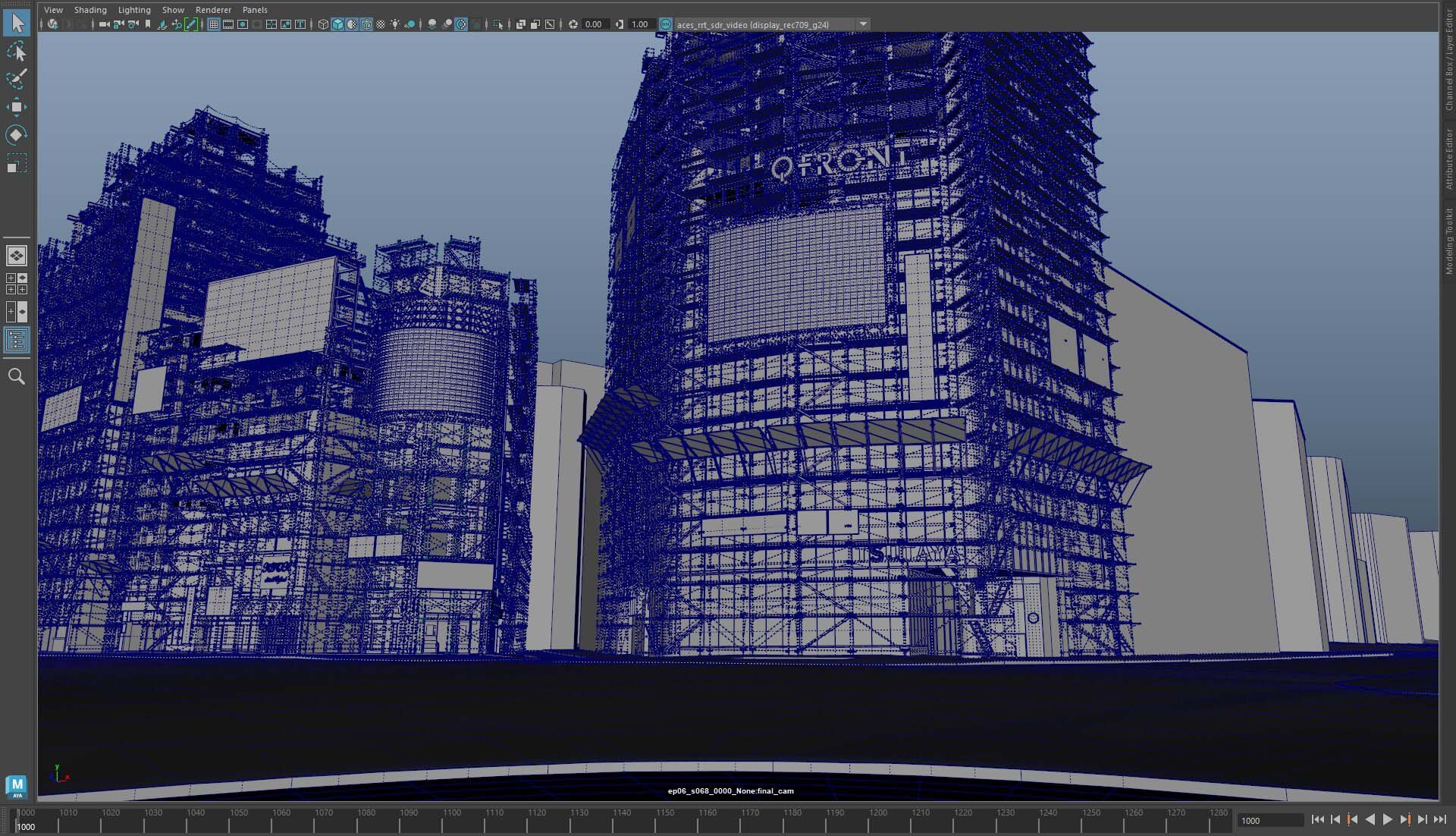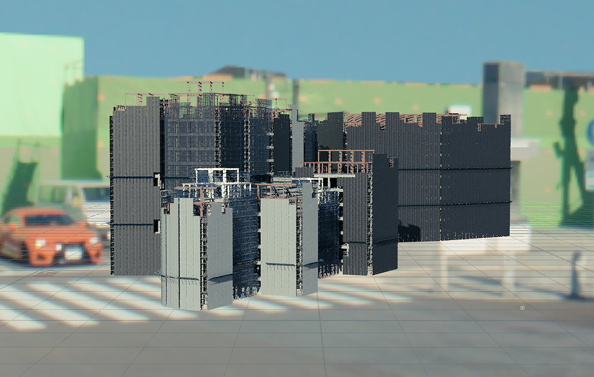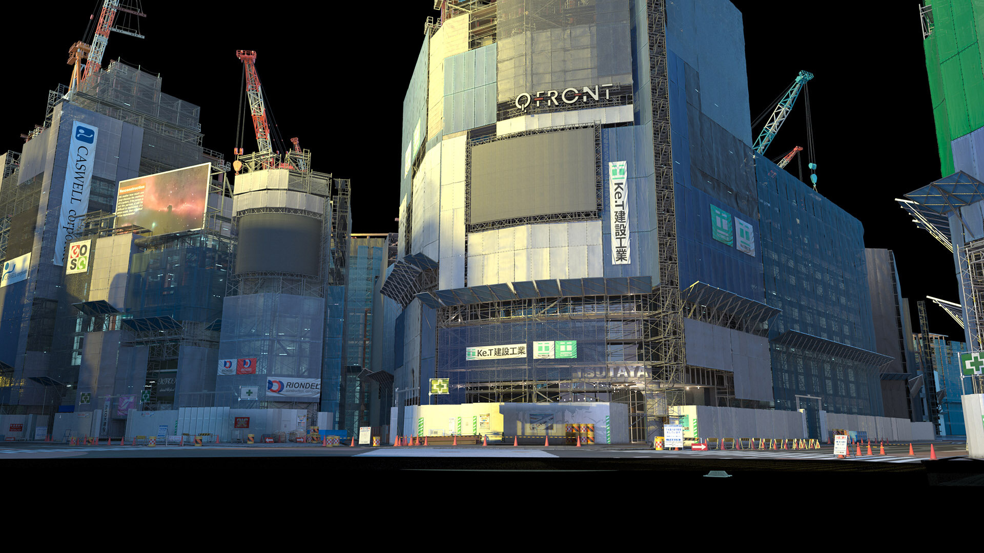 ▲ QFRONTのモデル(メッシュ表示、防護シートあり)。QFRONTなど、近景のビルはワンオフで作り込む一方では、奥のビルはボックスでレイアウト。それを基にHoudiniによるプロシージャルで生成。工事用の足場やシート、内部構造などのアセットが大量に求められたが、全て破壊できるように作成された