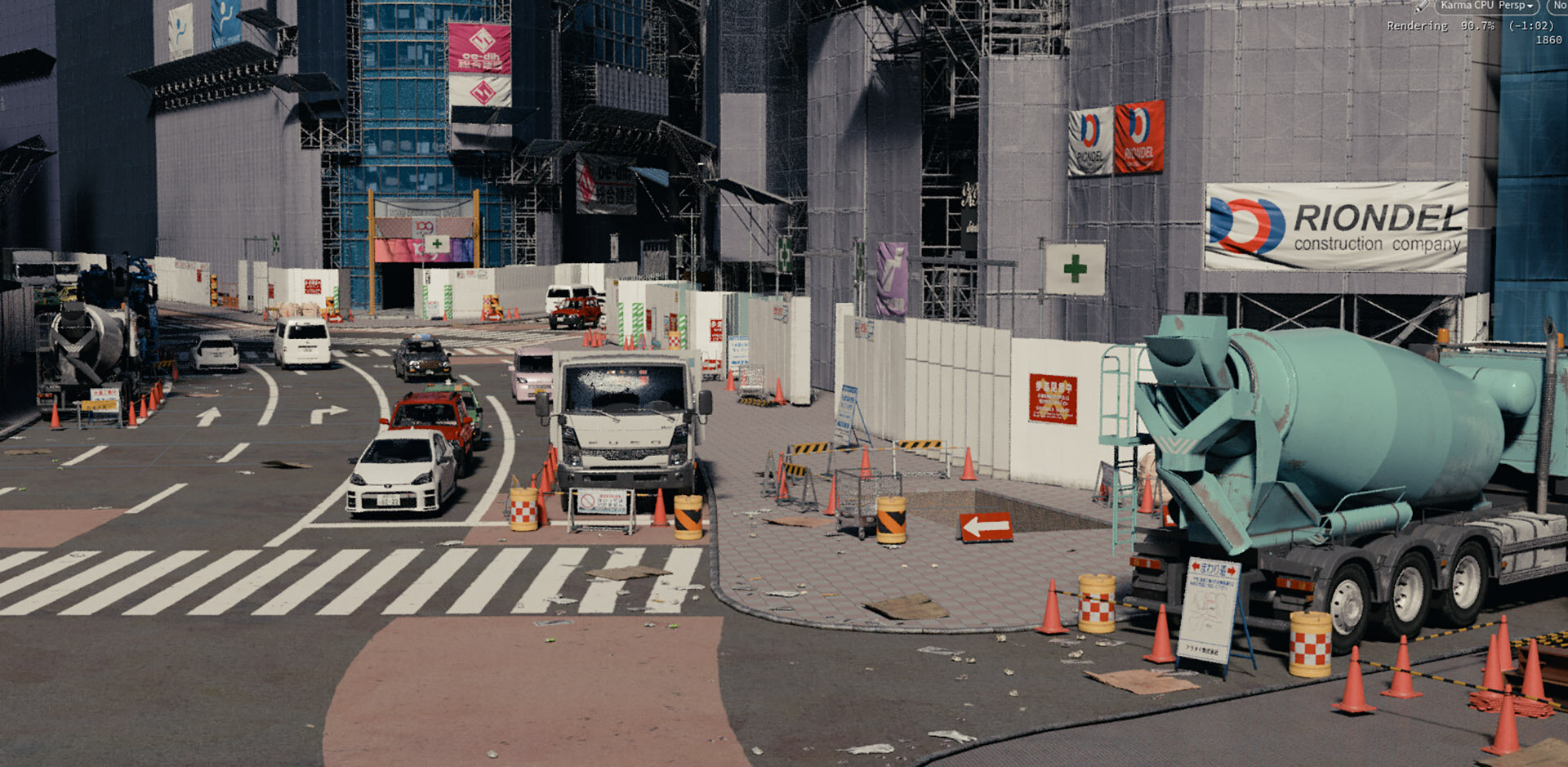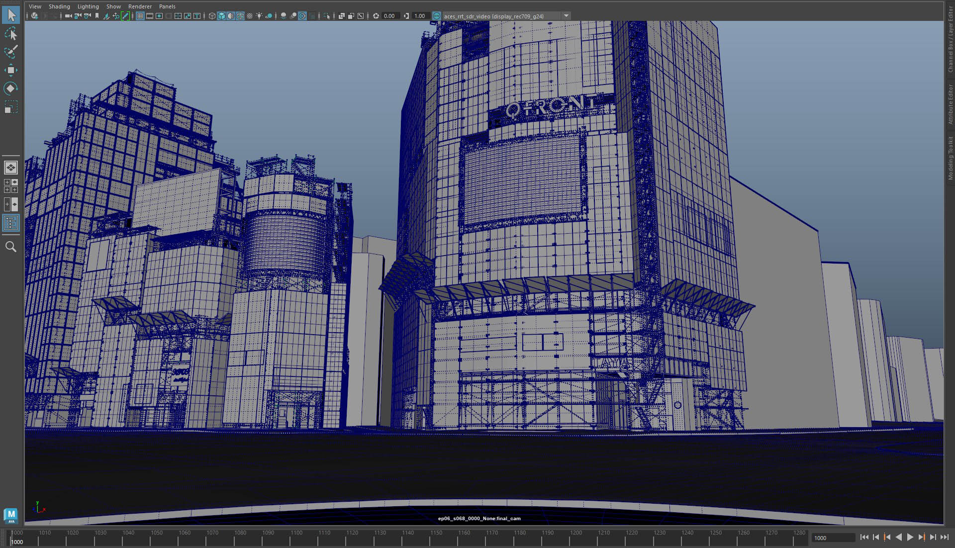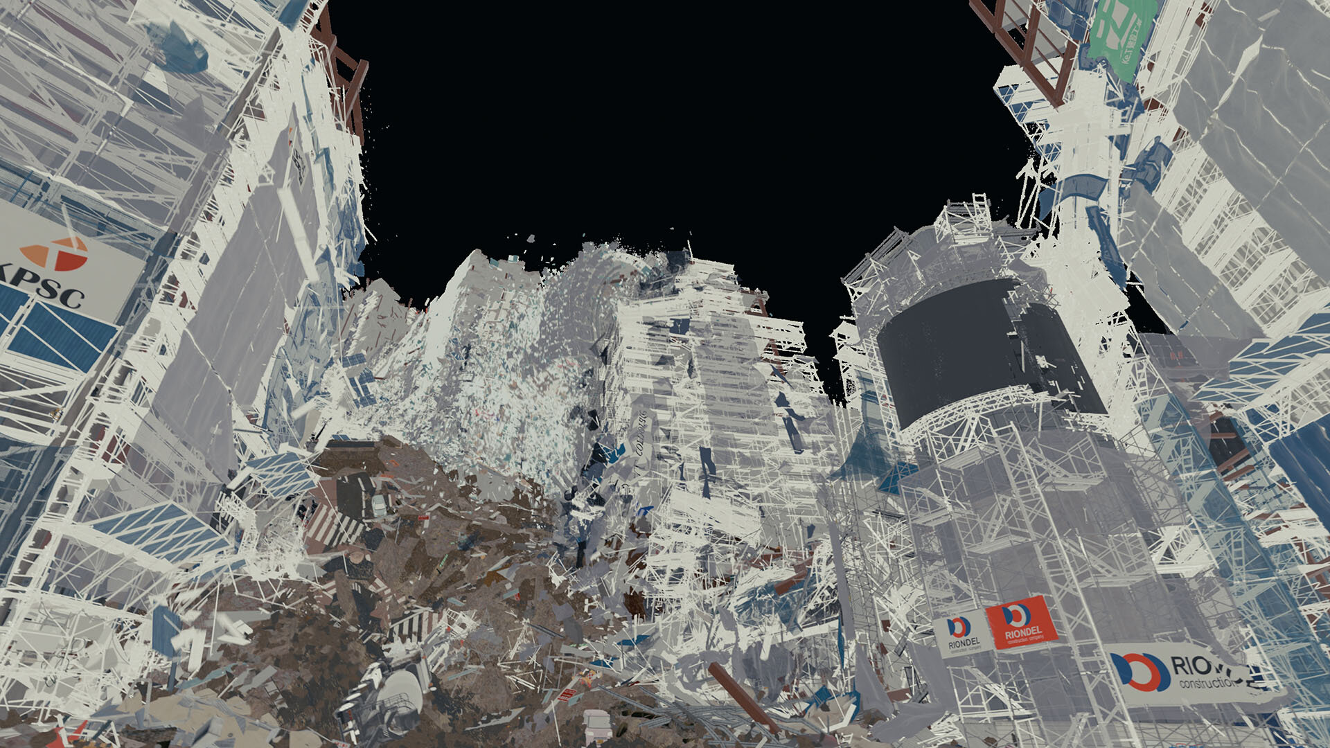 ▲ QFRONTのモデル(メッシュ表示、防護シートあり)。QFRONTなど、近景のビルはワンオフで作り込む一方では、奥のビルはボックスでレイアウト。それを基にHoudiniによるプロシージャルで生成。工事用の足場やシート、内部構造などのアセットが大量に求められたが、全て破壊できるように作成された