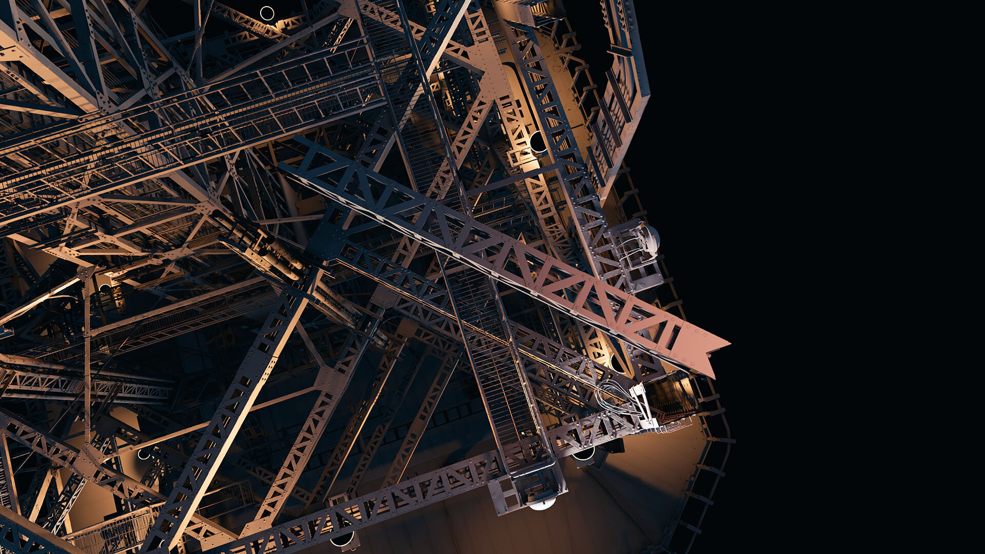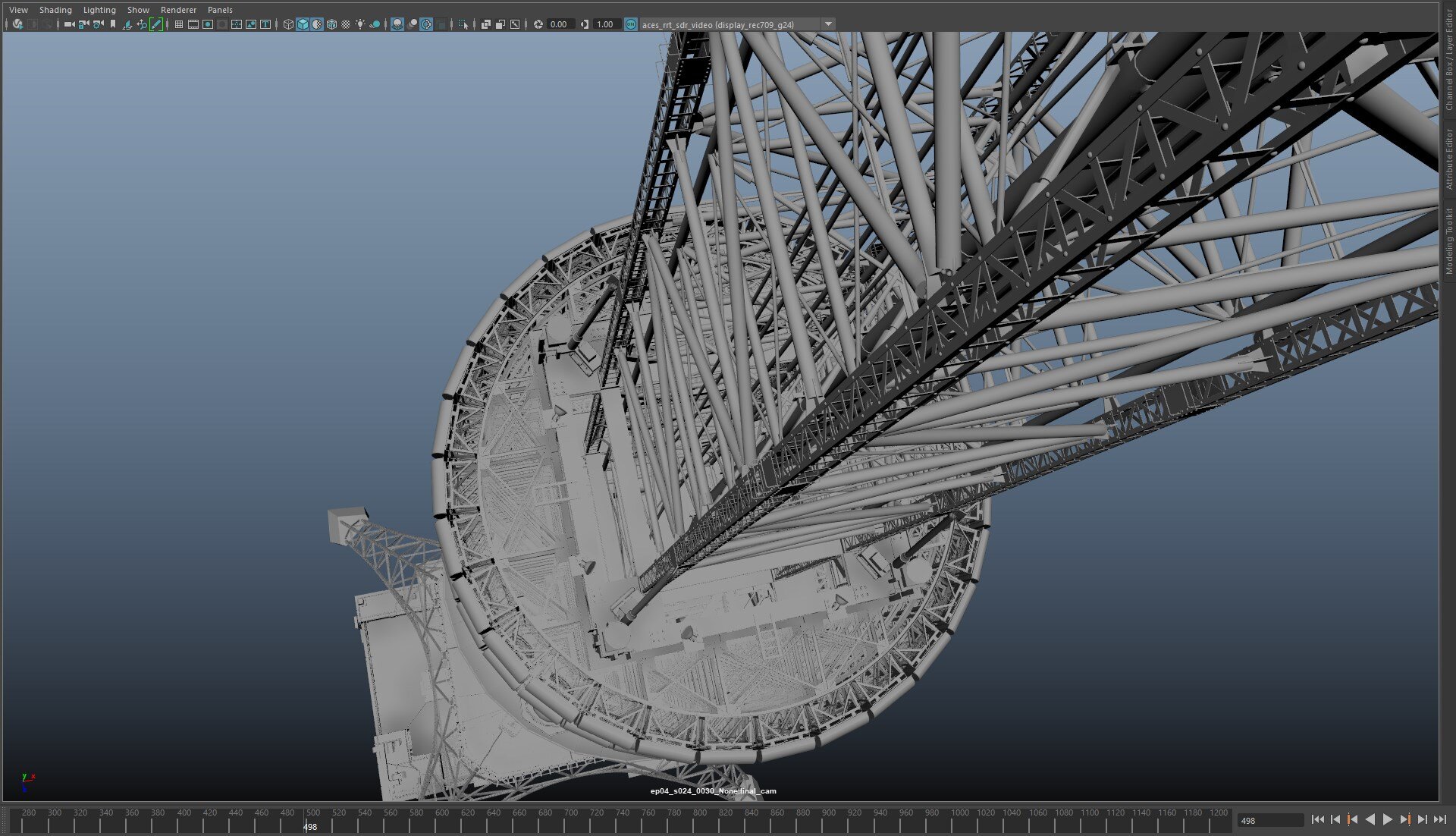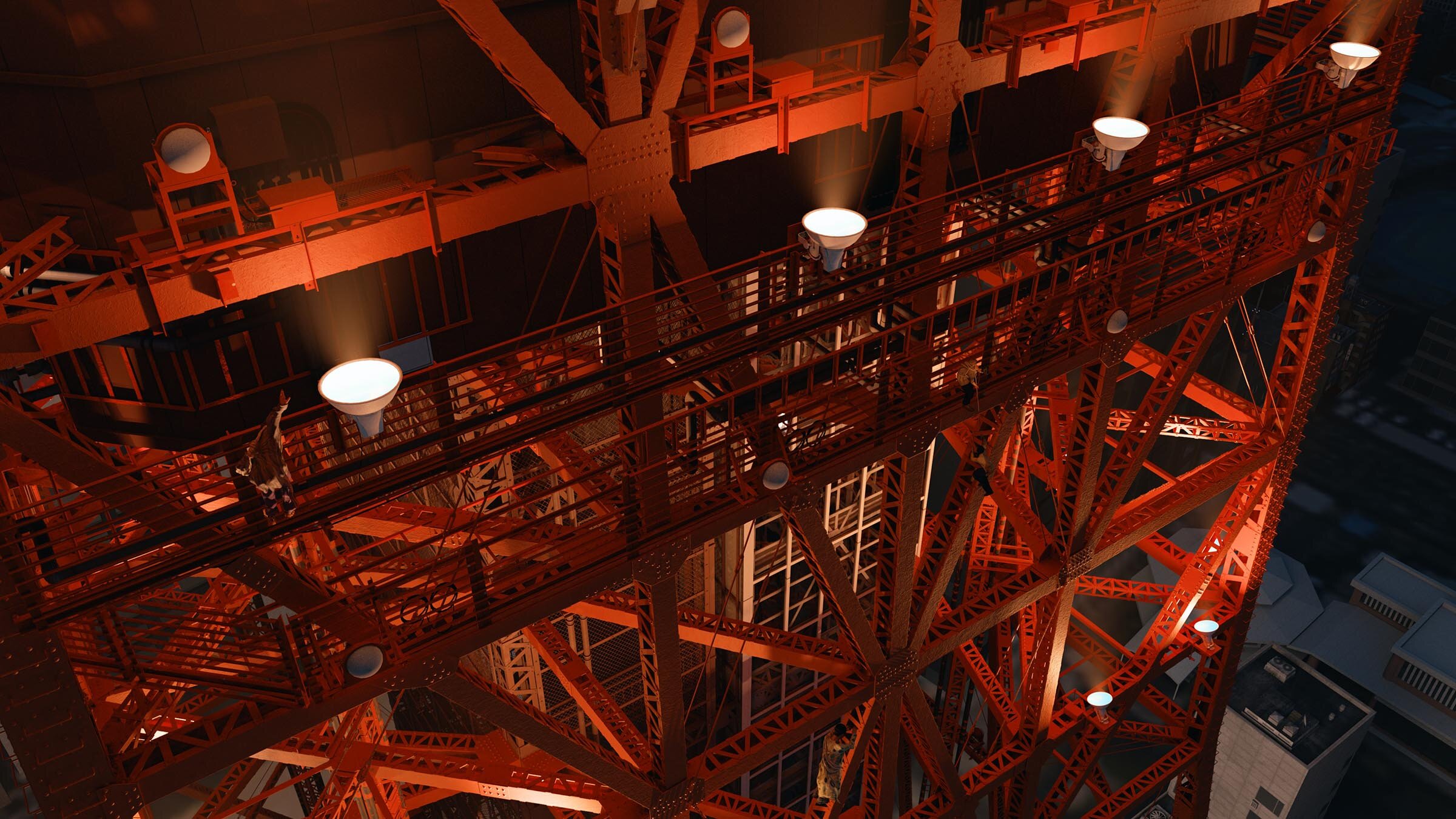 「タワーの頭頂部に近づくほどトラス構造がすぼまっていくので、セットのスキャンモデルとのギャップが大きくなりました。そこで3Dモデルをラティスでデフォームさせたり、余計なメッシュを消したりと、見た目合わせで調整するという地道な作業が多く発生しました。またカメラワークとしても低い位置から上空へと、ドローンで撮ったように回り込むカットも多く登場します。そうしたカメラワークはCGで付けていますが、実写プレートのトラッキングデータをオフセットで調整するといった作業も大量に発生しました」と、プロジェクトSVとライティングリードを兼務した安藤弘樹氏。