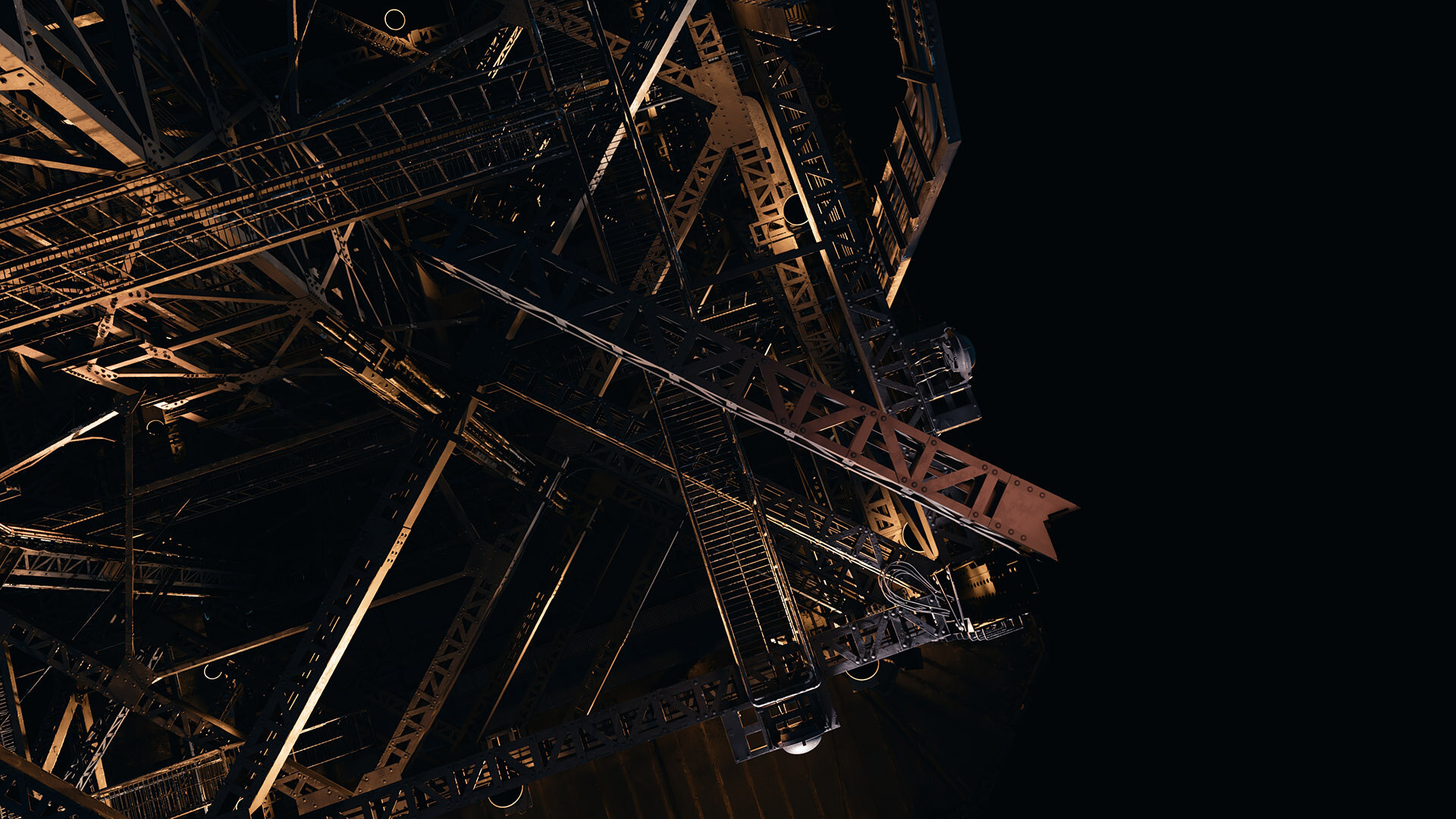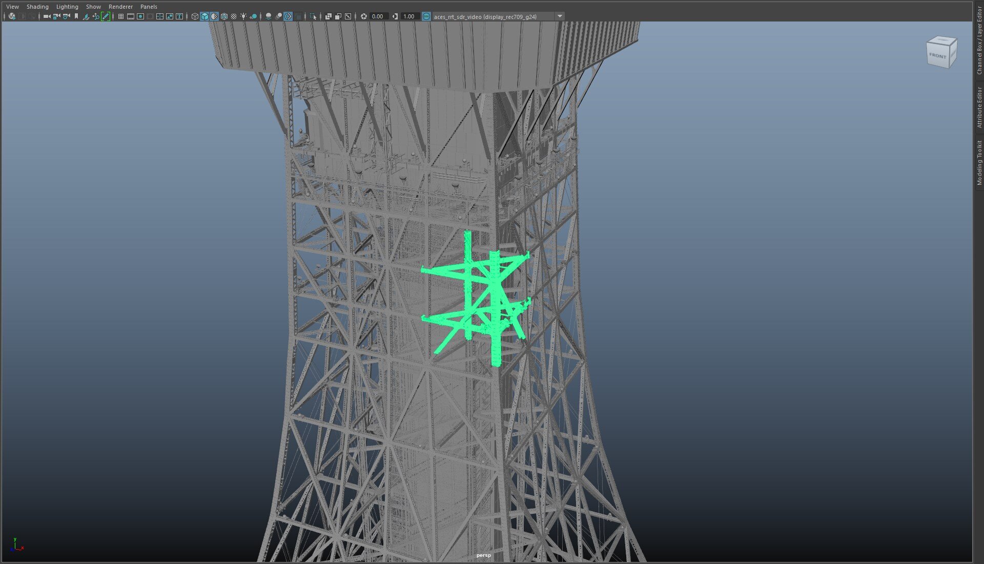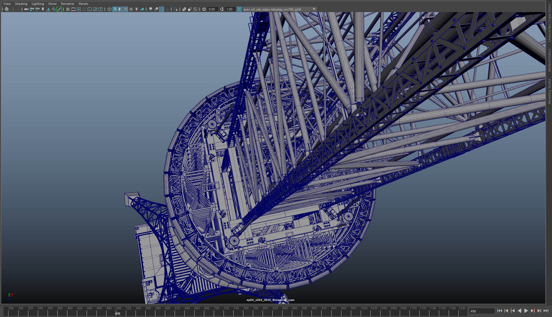 「タワーの頭頂部に近づくほどトラス構造がすぼまっていくので、セットのスキャンモデルとのギャップが大きくなりました。そこで3Dモデルをラティスでデフォームさせたり、余計なメッシュを消したりと、見た目合わせで調整するという地道な作業が多く発生しました。またカメラワークとしても低い位置から上空へと、ドローンで撮ったように回り込むカットも多く登場します。そうしたカメラワークはCGで付けていますが、実写プレートのトラッキングデータをオフセットで調整するといった作業も大量に発生しました」と、プロジェクトSVとライティングリードを兼務した安藤弘樹氏。
