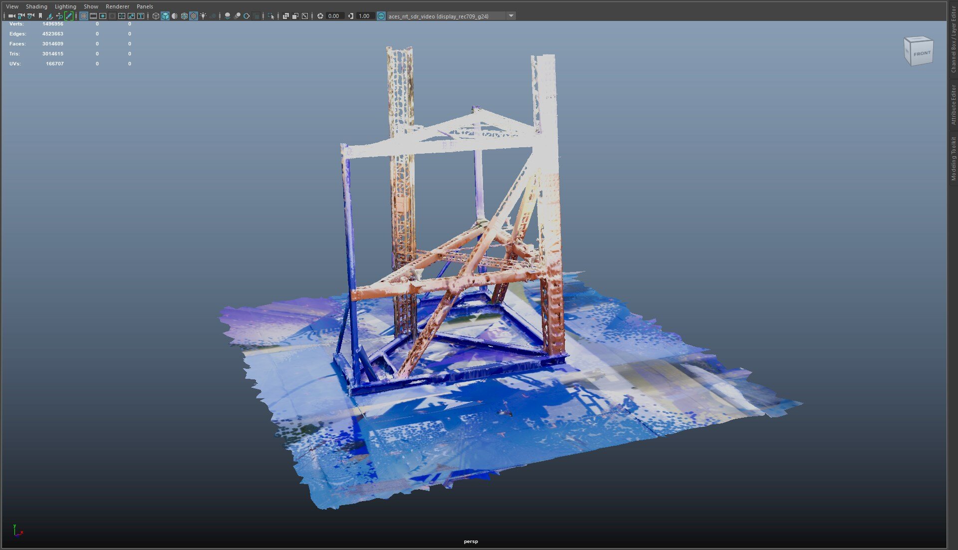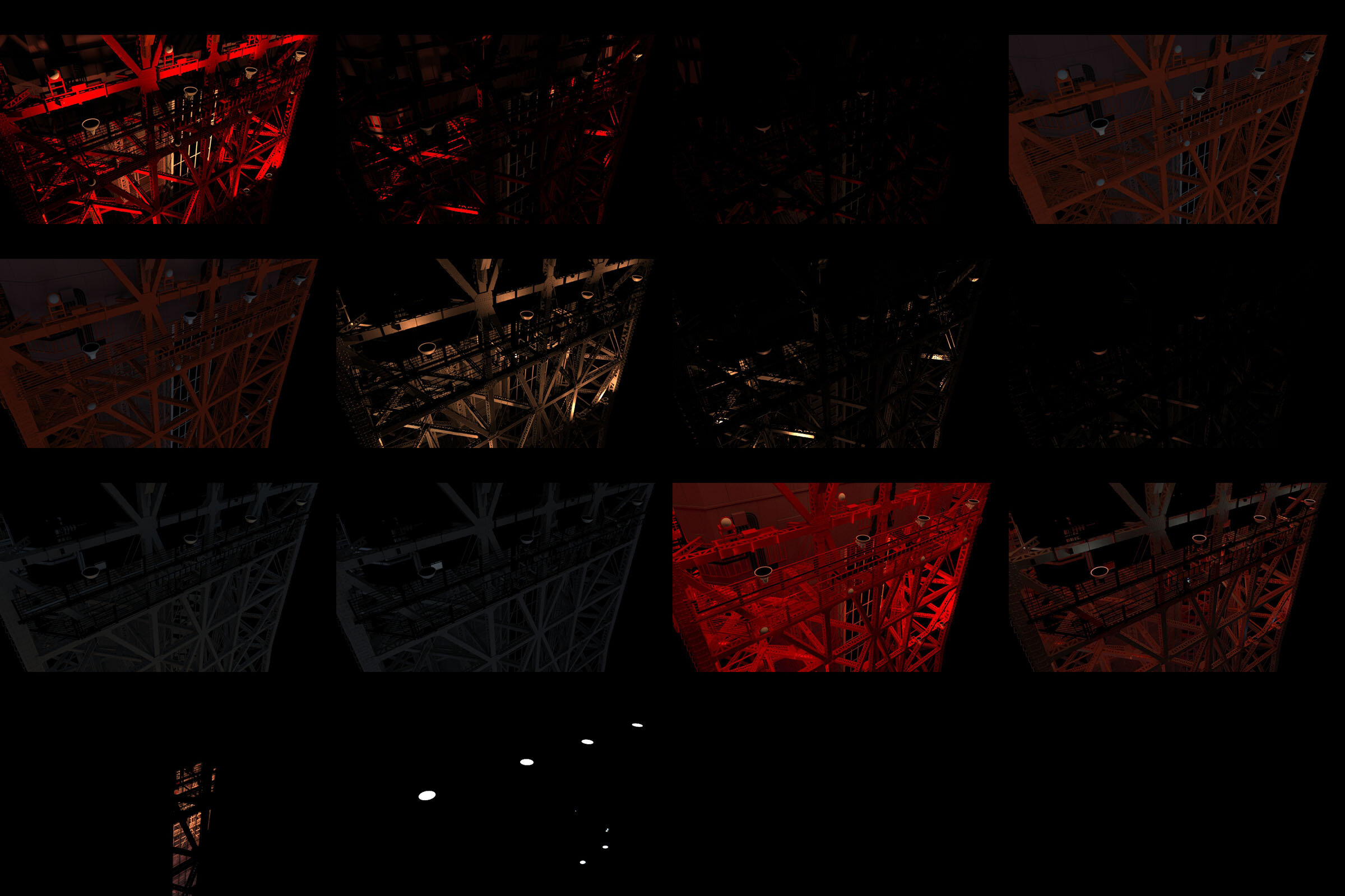 ▲ 「げぇむ:東京BINGOタワー」の舞台となる東京タワーのスタジオセットの3Dスキャン素材(メッシュ)。ここから必要なフレーム部分だけ切り出し、どの階層でも使用できるように外のフレームの角度をベースに東京タワーを作成する -