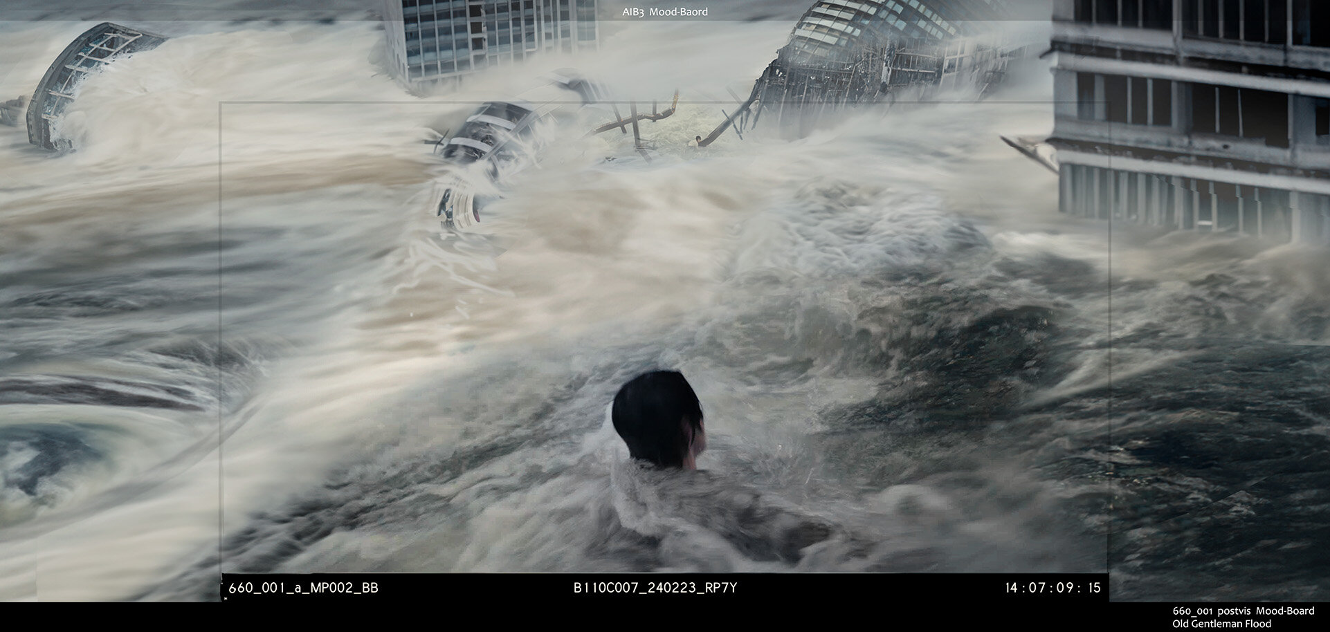 「土石流に飛び込んだアリス(有栖良平、演:山﨑賢人)が渋谷から六本木方面へと流されていくのですが、実写プレートのトラッキングデータをレイアウトしたアニメーションに親子付けした後に、さらにショット単位で位置を調整するという作業が大量に発生しました。ほぼ全ての動きを手付けで調整しています」(安藤氏)。
