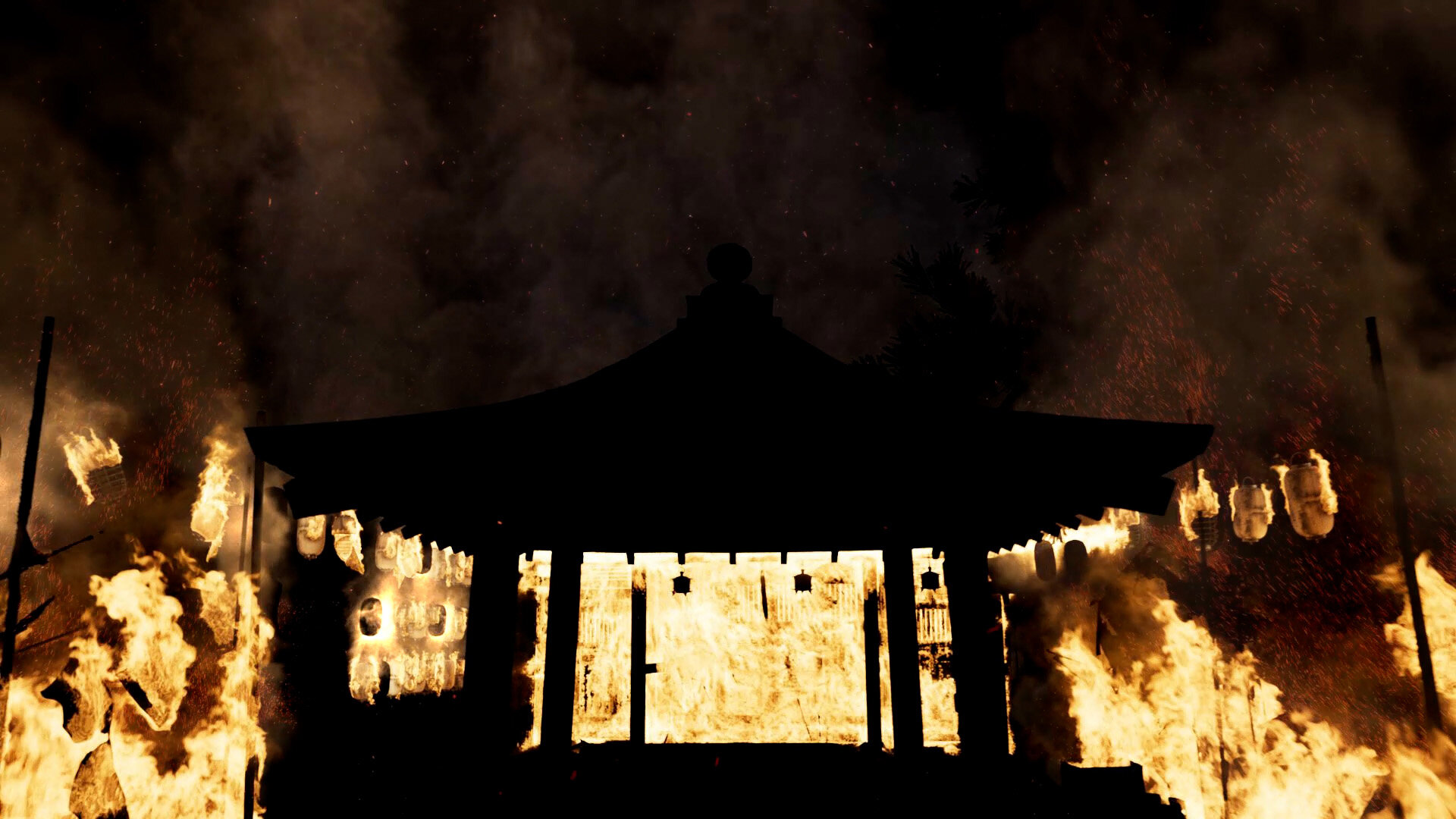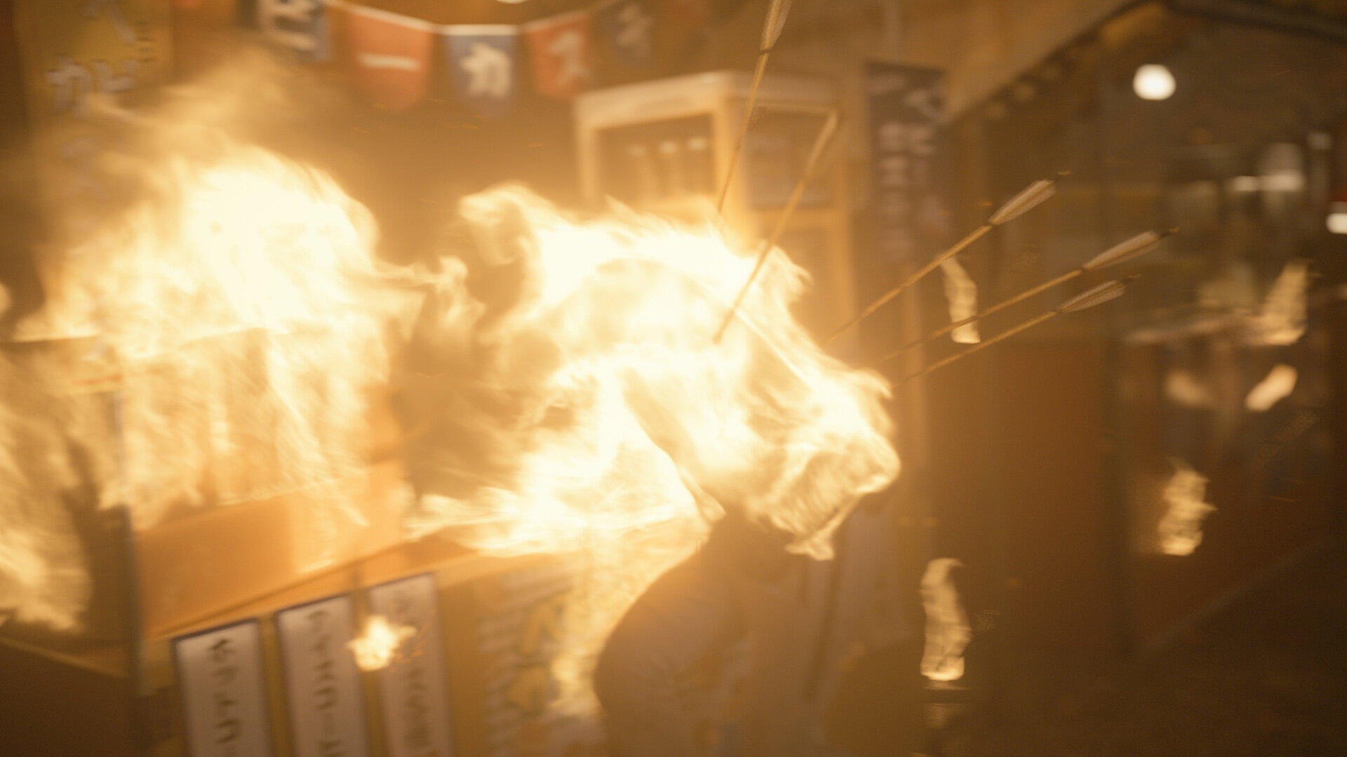 「プレイヤーの身体に火矢が刺さる表現については、炎の照り返しがほしかったので実写撮影時に役者さんにLEDライトを装着して撮ったりもしました。現場で実際に火を炊いたのは床に置いたものぐらいです。大量の炎エフェクト作業が発生しましたが、THE SEVENのチームが良いものに仕上げてくれました」(土井氏)。