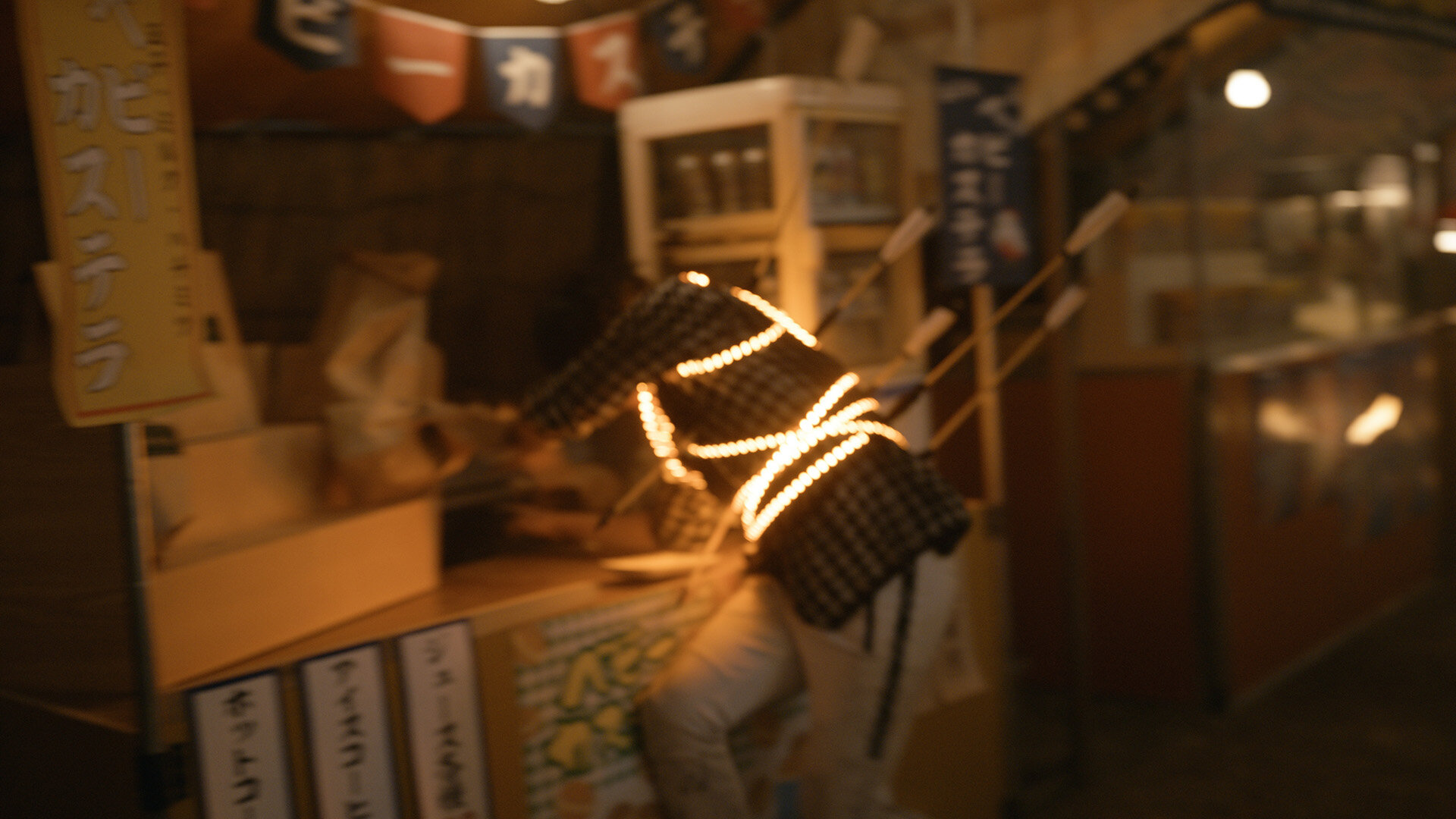 ▲げぇむ『おみくじ』の撮影では、火矢がプレイヤーの身体に刺さったときのリアルな照り返しを加えるためにLEDライトを装着した状態で演じてもらっていた(図は、実写プレート) -