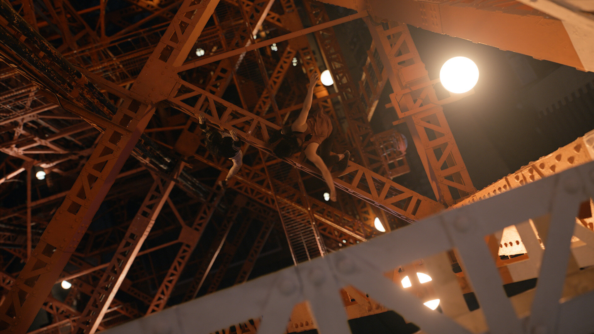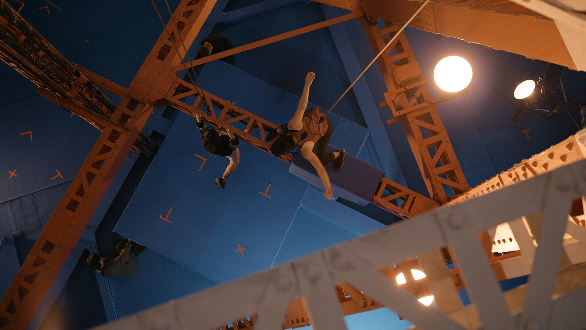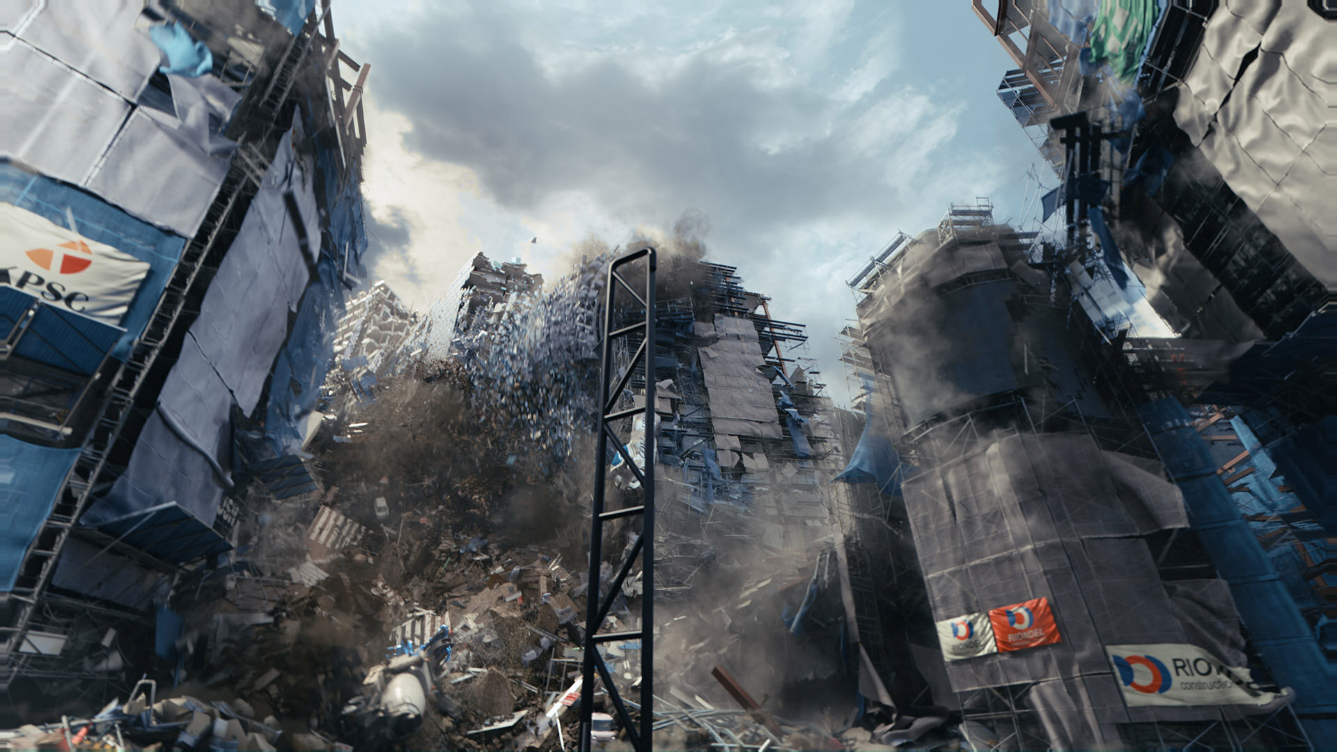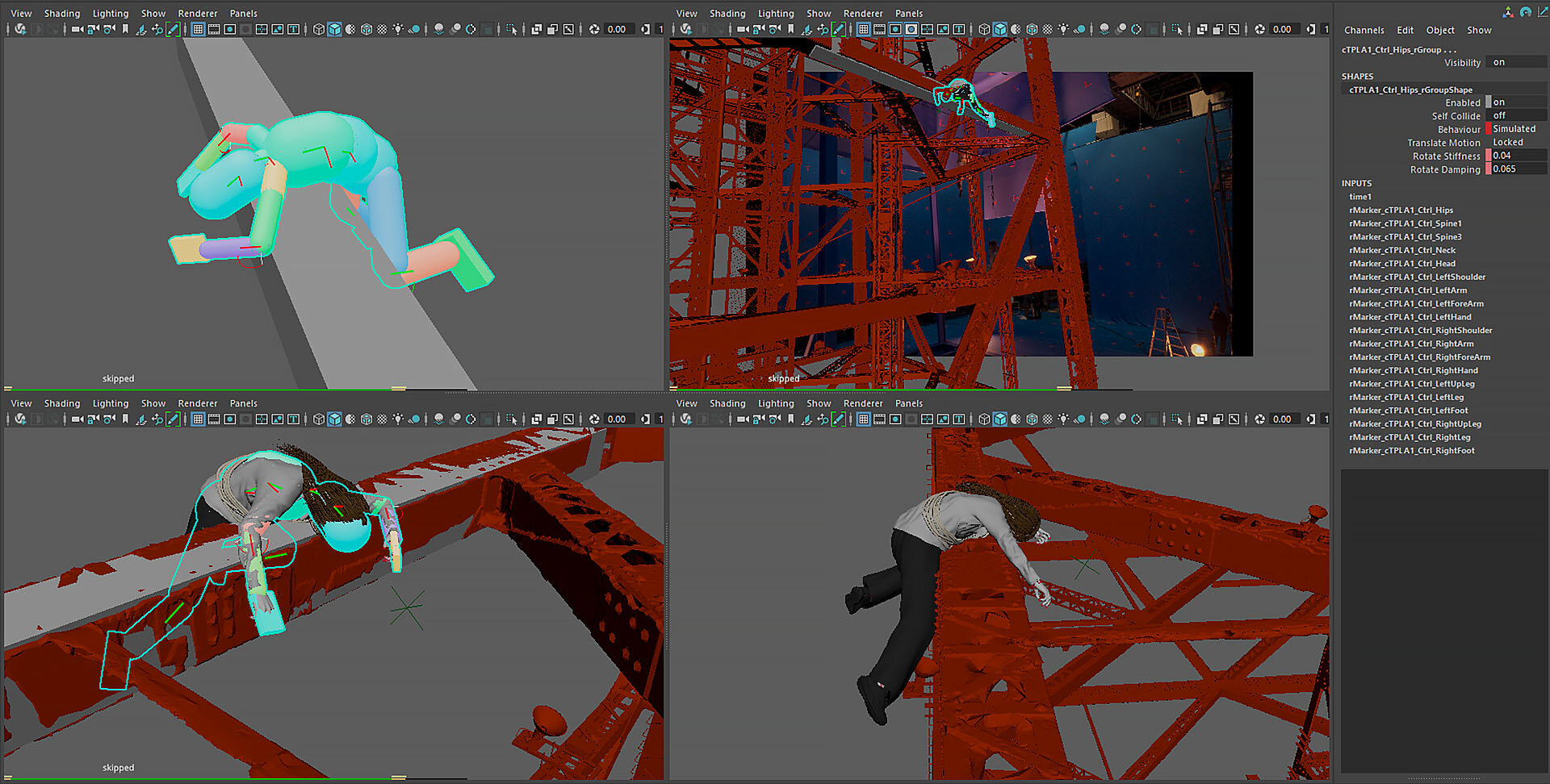 「プレイヤーがタワーから転落して死亡する表現については、役者さんをワイヤーで吊った演技も撮りましたが、その素材をショットに組み込むと転落するスピードが遅い印象でした。ほかにも転落の途中で鉄骨の構造に当たって絶命するという表現では、実写プレートの演技だとどうしても生きている印象が残ってしまうことがありました。そこで役者さんのデジタルダブルを作成して、MayaプラグインのRagdoll Dynamicsという物理シミュレーションソルバを利用して転落するアニメーションを付け直しています」(土井氏)。