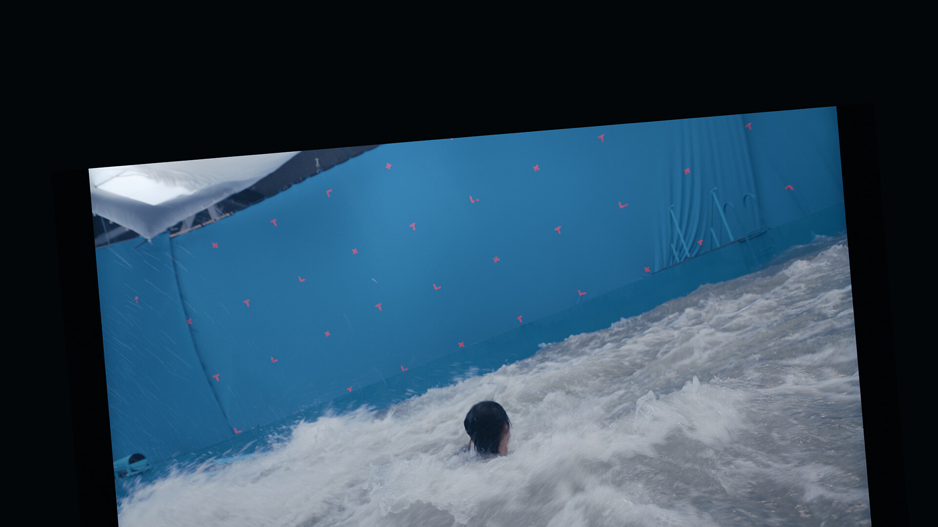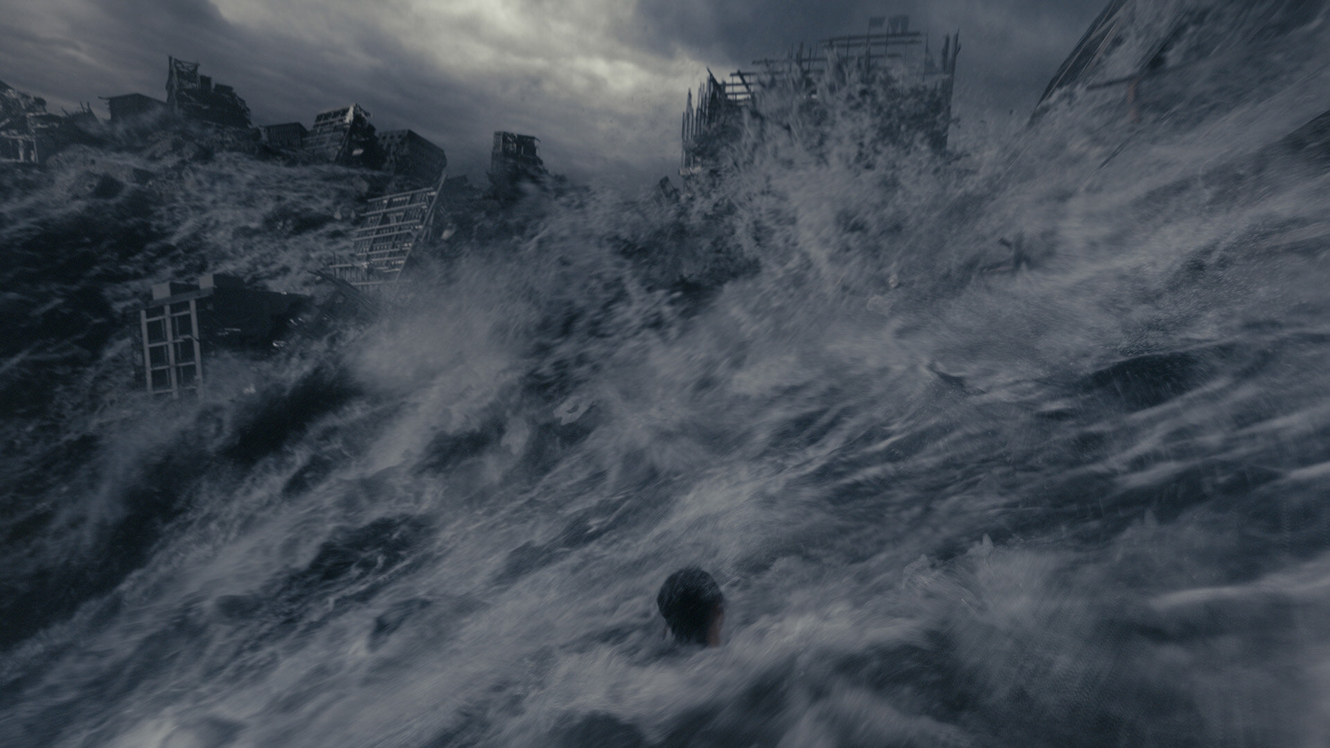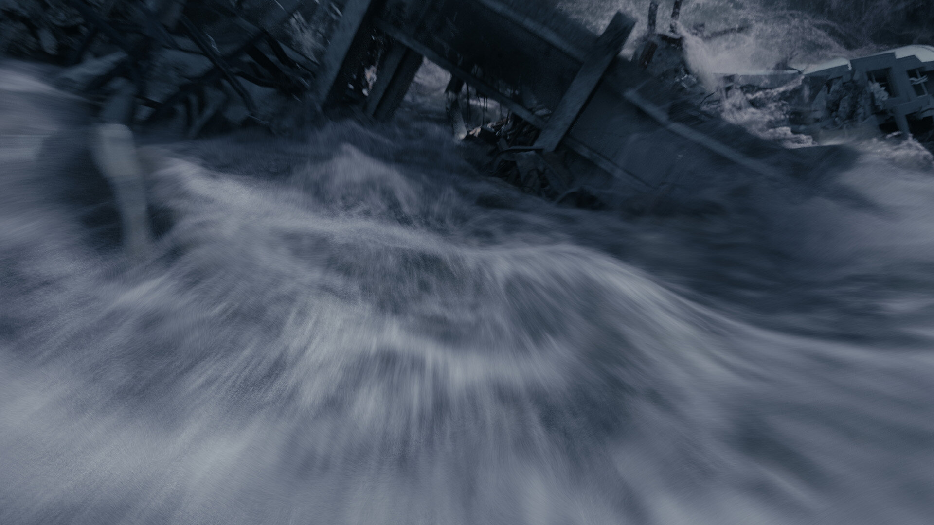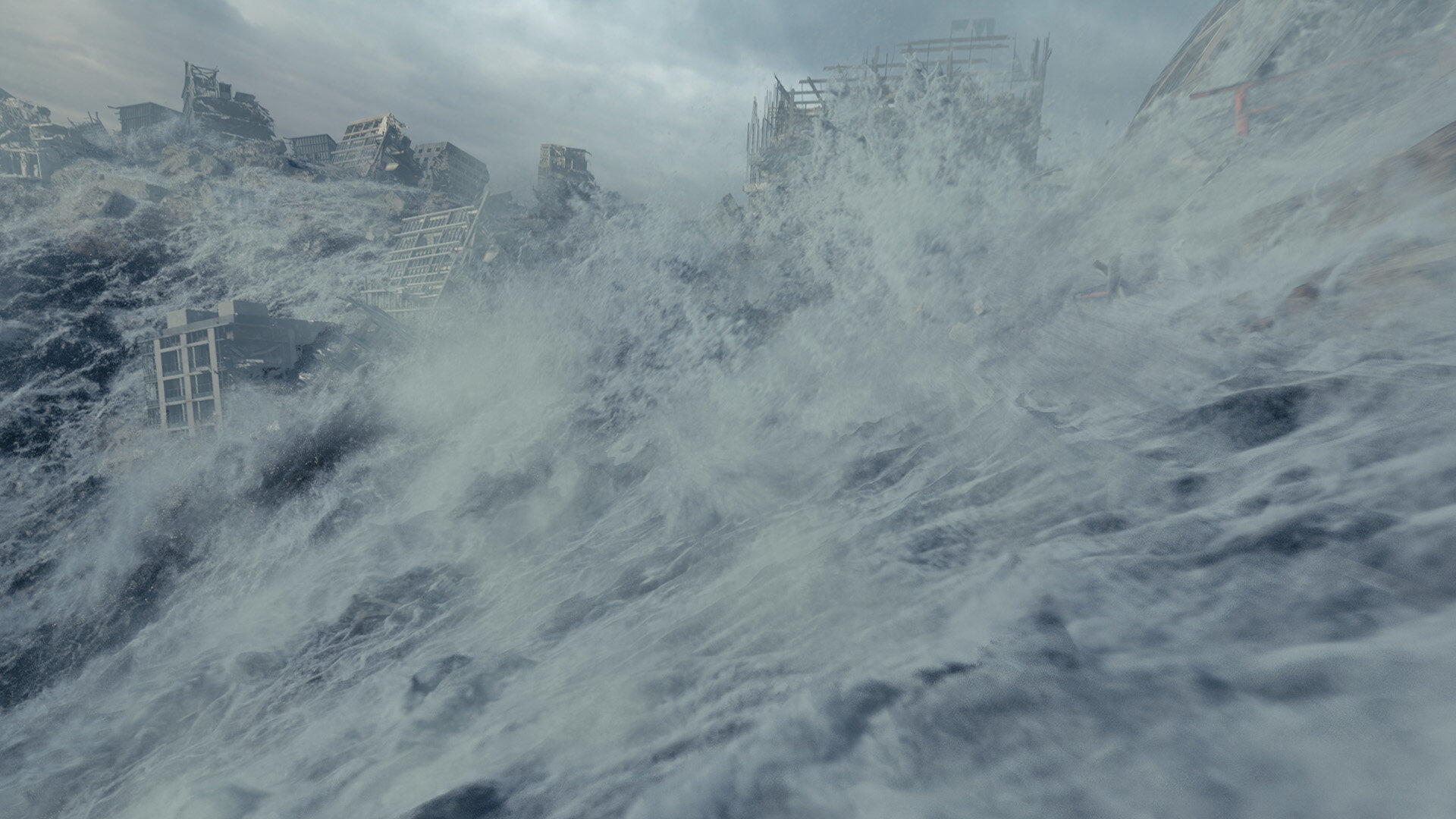 「ブラックホールのように呑み込む渦のエフェクト作業では、直径400m程度という巨大な渦のためWhitewaterは一度に出せる量ではありませんでした。そこで、Wedgeで10~30ほどのエリアに分けてシミュレーションしました。土石流の速度も時速60kmが基本となったため、実写プレートの水流との差異を埋めるために役者さんの付近だけスピードを調整したものを別途シミュレーションして、組み合わせています」(角田氏)。