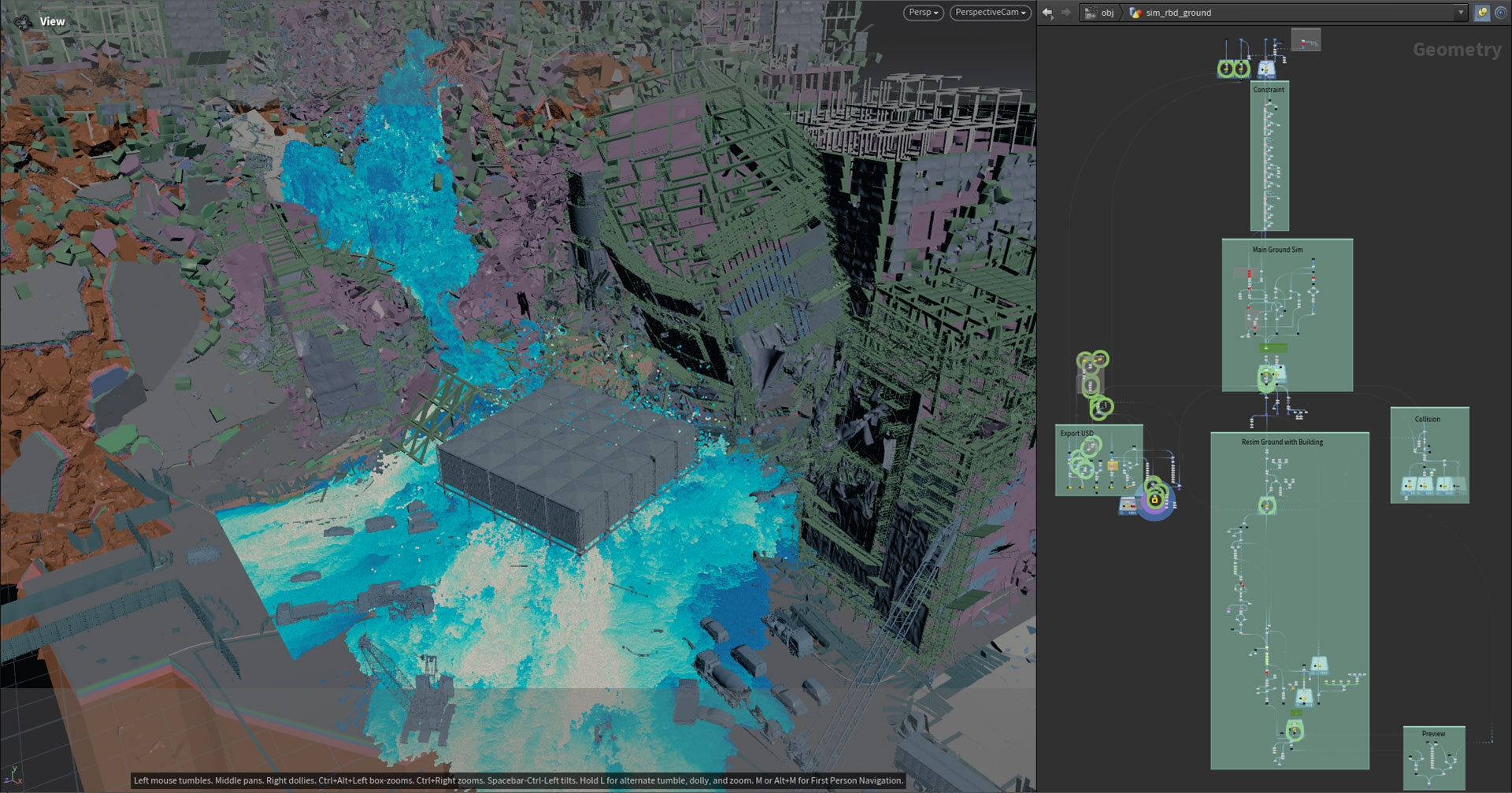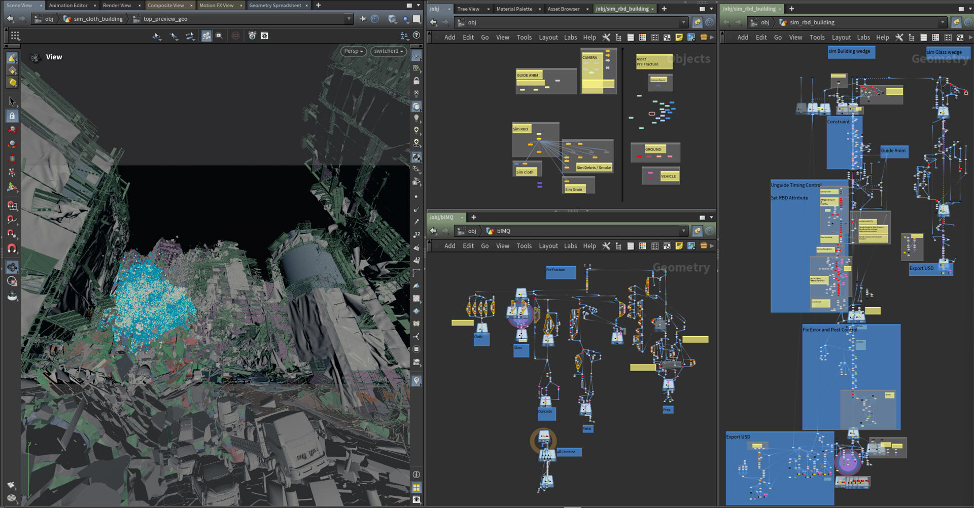 「SolarisによるUSDベースのワークフローになったことで、背景セットが初期のローポリのときからFXチームに破壊のシミュレーションの検証を進めてもらうことができました。階層の構造を事前にしっかりと決めておくことで、後からハイポリのモデルに差し替えても特にトラブルは発生しませんでした」(土屋氏)。