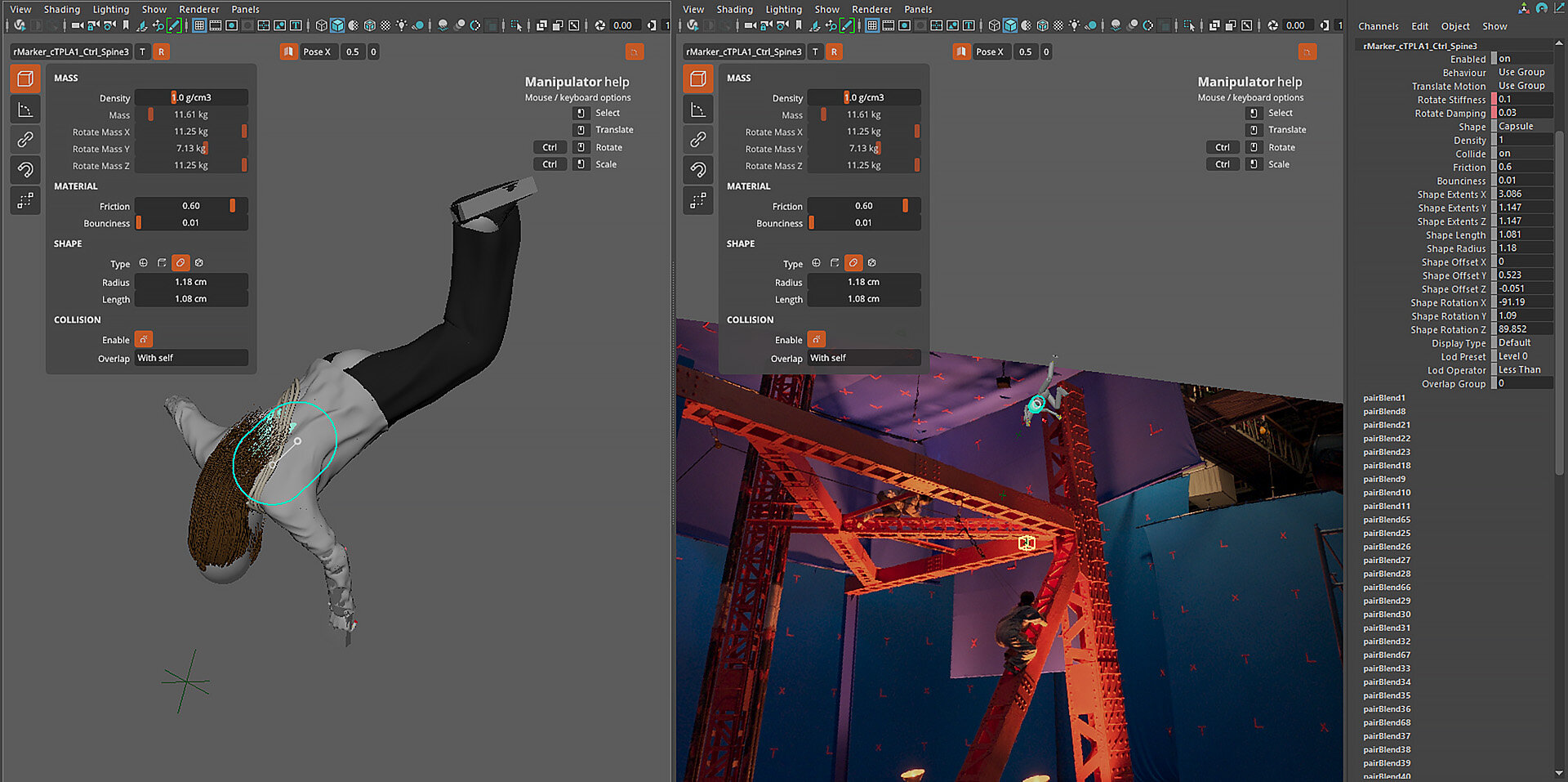 「鉄骨に当たって絶命する表現では、当たる直前までは実写プレート(役者の演技)を使い、衝突した瞬間からデジタルダブルに切り替えています。Ragdoll Dynamicsを用いることで絶命して脱力した状態で落下するニュアンスを出すことができました」と、アニメーションリードの矢舩貴之氏。