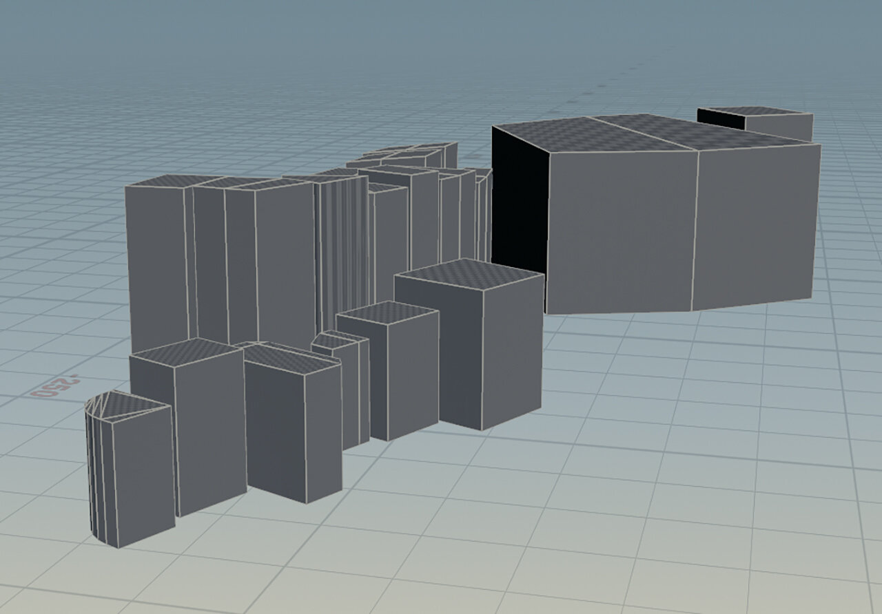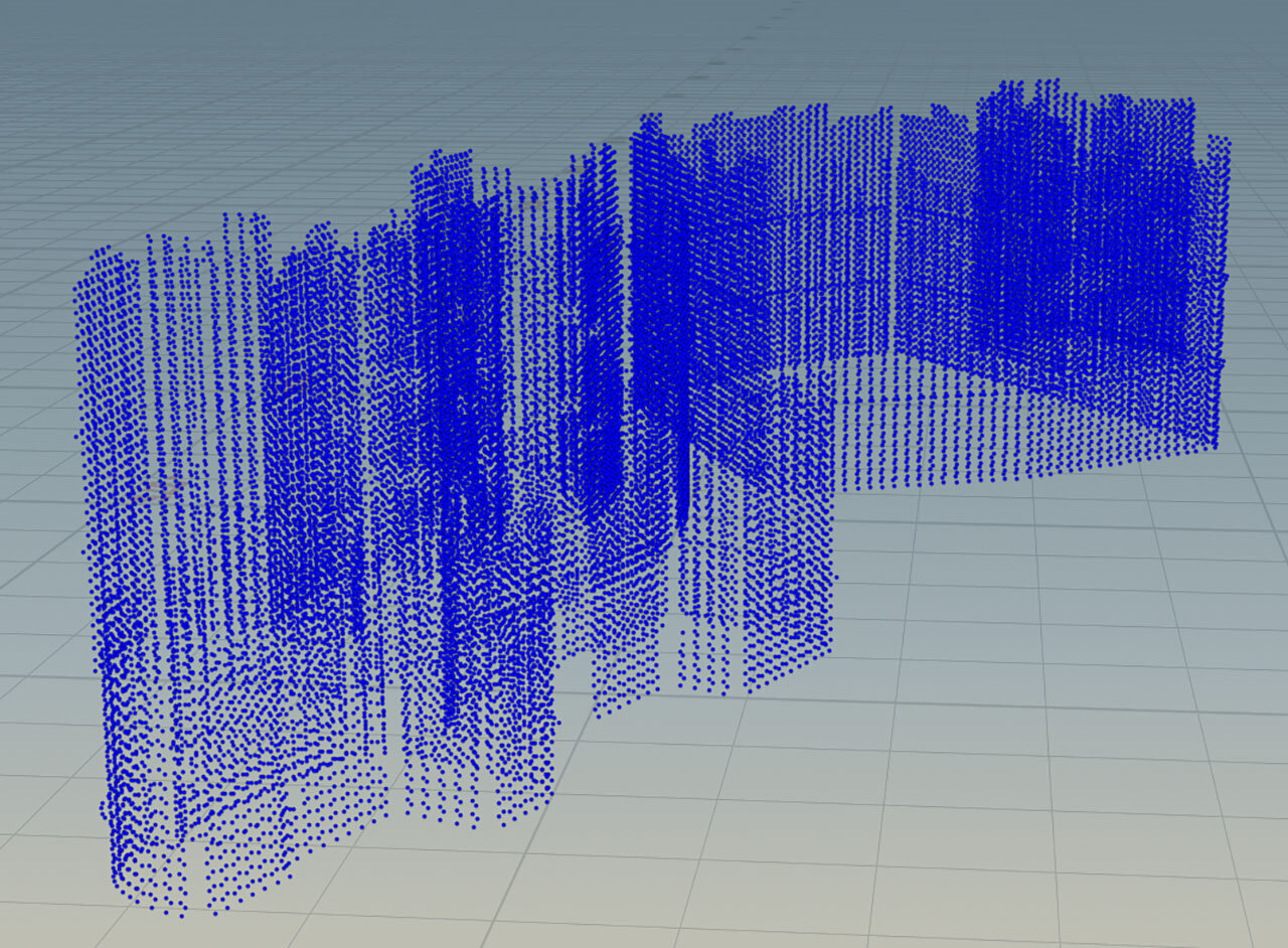 ▲ Mayaで作成したビルを生成するにあたり、モデルに対してポイントを配置。建物のシルエットや形状を解析し、それに基づいて配置用のポイントが生成される