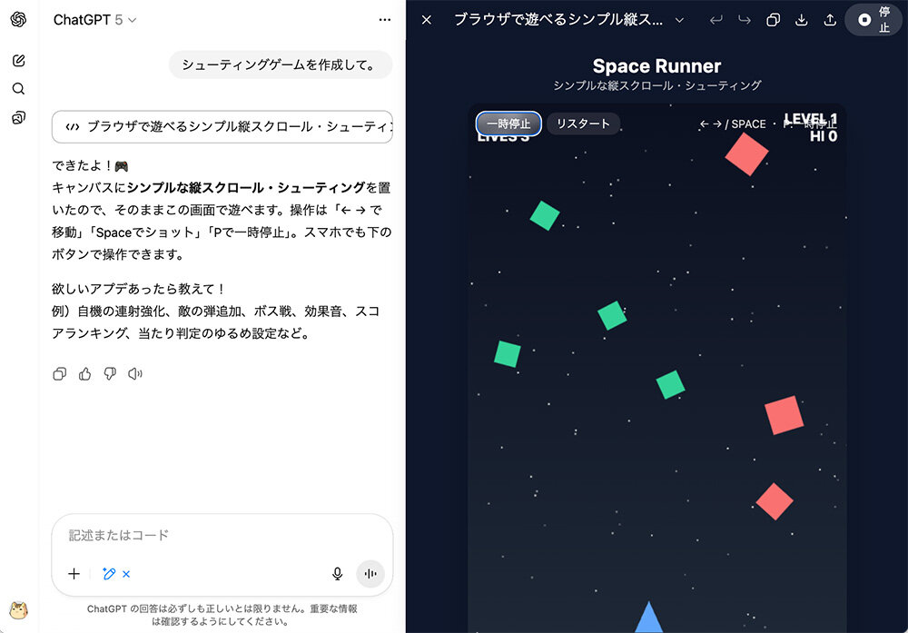 例えば「ブラウザで遊べるスクロールゲームをつくって!」と入れるだけで、あっという間にゲームができて、すぐにその場で遊べます。ゲームの改良も「連射機能を追加して」などと指示することで対応してくれます。ゲームに限らず、CGソフトのプラグインなどの制作も可能です。自分専用のプログラマーがいつも身近にいるので、つくってみたいものは何でも頼んで試してみましょう。
