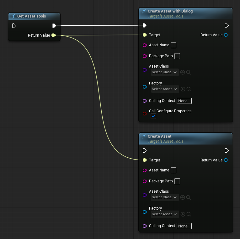 アセット操作は、Editor Utilityウィジェットにおいてアセット管理の中核を担う[Asset Tools]を介して実行します。アセットの作成も、[Asset Tools]内の[Create Asset]関数などを使用して実行可能です。