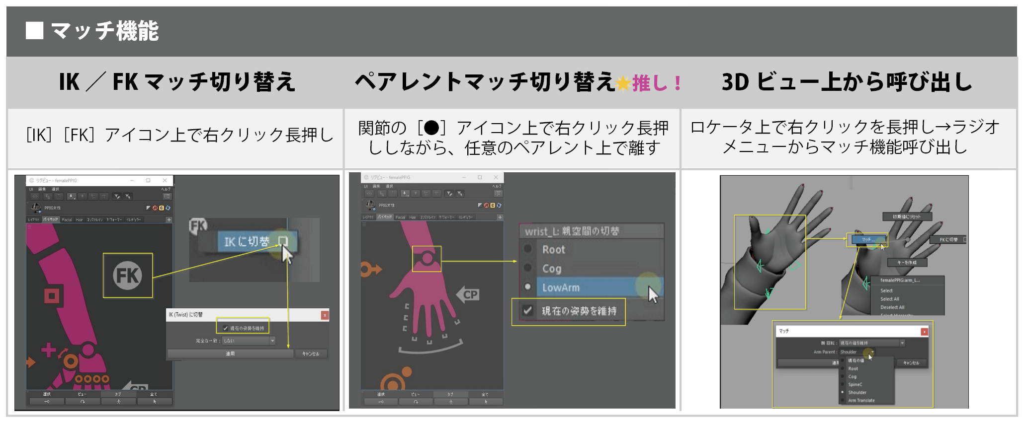 腕は腰(Cog)の動きに追従するように、ペアレントを切り替えておくとポーズの調整がしやすくなります。eSTの[ペアレントマッチ]機能を使えば、ポーズを変えることなく任意のペアレントに切り替えることが可能です。