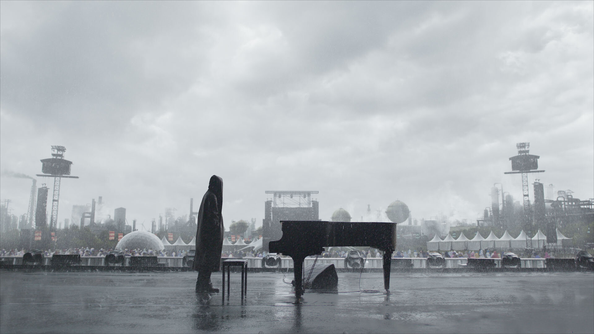▲ <STEP 1>ep1序盤で描かれる、雨天に見舞われた3年前の「ROCK ALIVE JAPAN」シーンに登場するステージ上の藤谷直季(佐藤 健)ロングショットのブレイクダウン。図は、空素材。ep1シーケンス全体で利用されている -
