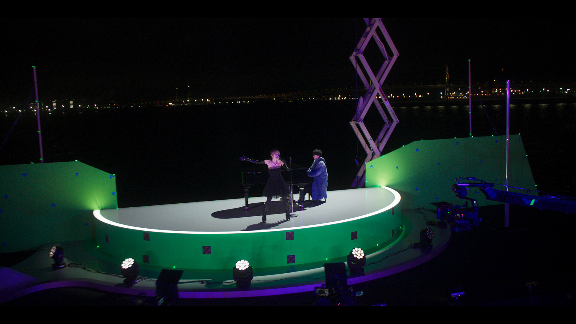 「セレブリティ2号は洋上を航行するシーンが多く、コンポジット作業時に水面への照り返しなどをつくる必要がありました。水面は常に揺れているので見た目を馴染ませるのが大変でしたね。野外ステージについては、KASSENさんが担当されたシーンと同様にリアルの照明演出との整合性が求められました。ステージのデザインについては、コンセプトモデルを作ることから始めて、こちらから提案するかたちで作業を行いました。エヌ・デザインにとってもライブシーンのVFXは初めてでしたが、ライブ特有の臨場感を意識しながら画づくりを行いました」と、エヌ・デザインの川瀬基之VFXプロデューサー。ユキノのライブは夜に行われたため、髪の毛の合成処理も非常にシビアな調整が求められたそうだ。