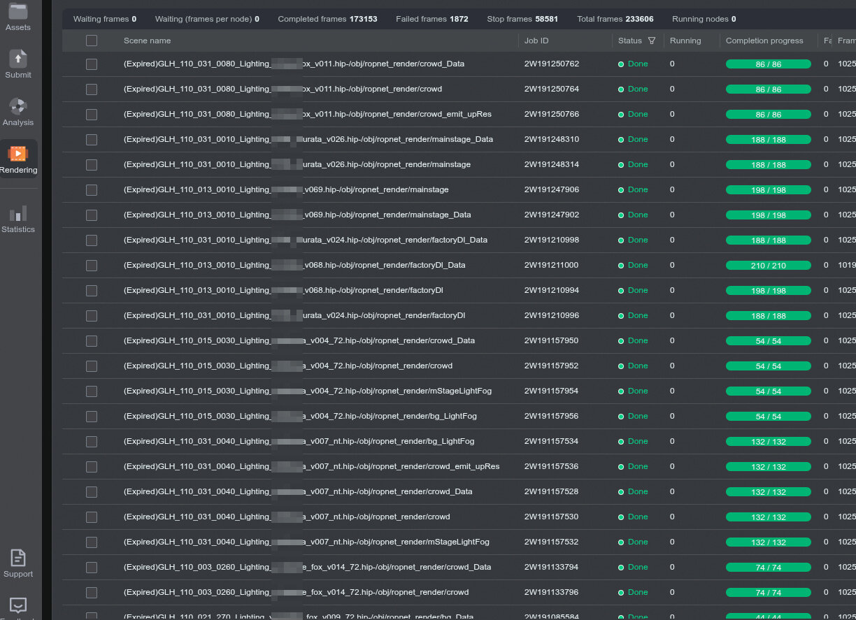 本番運用時は1TB以上に達したアセットをアップロードする必要があったため、アップロード専用の10Gbps回線を設置して、FOX Renderfarmのマスターアカウントにアップ。それをアーティスト用アカウントに共有設定することでトランザクションを節減させた。最終的に13万フレーム以上のレンダリングをFOXで行い、納期に間に合わせることができたという。
