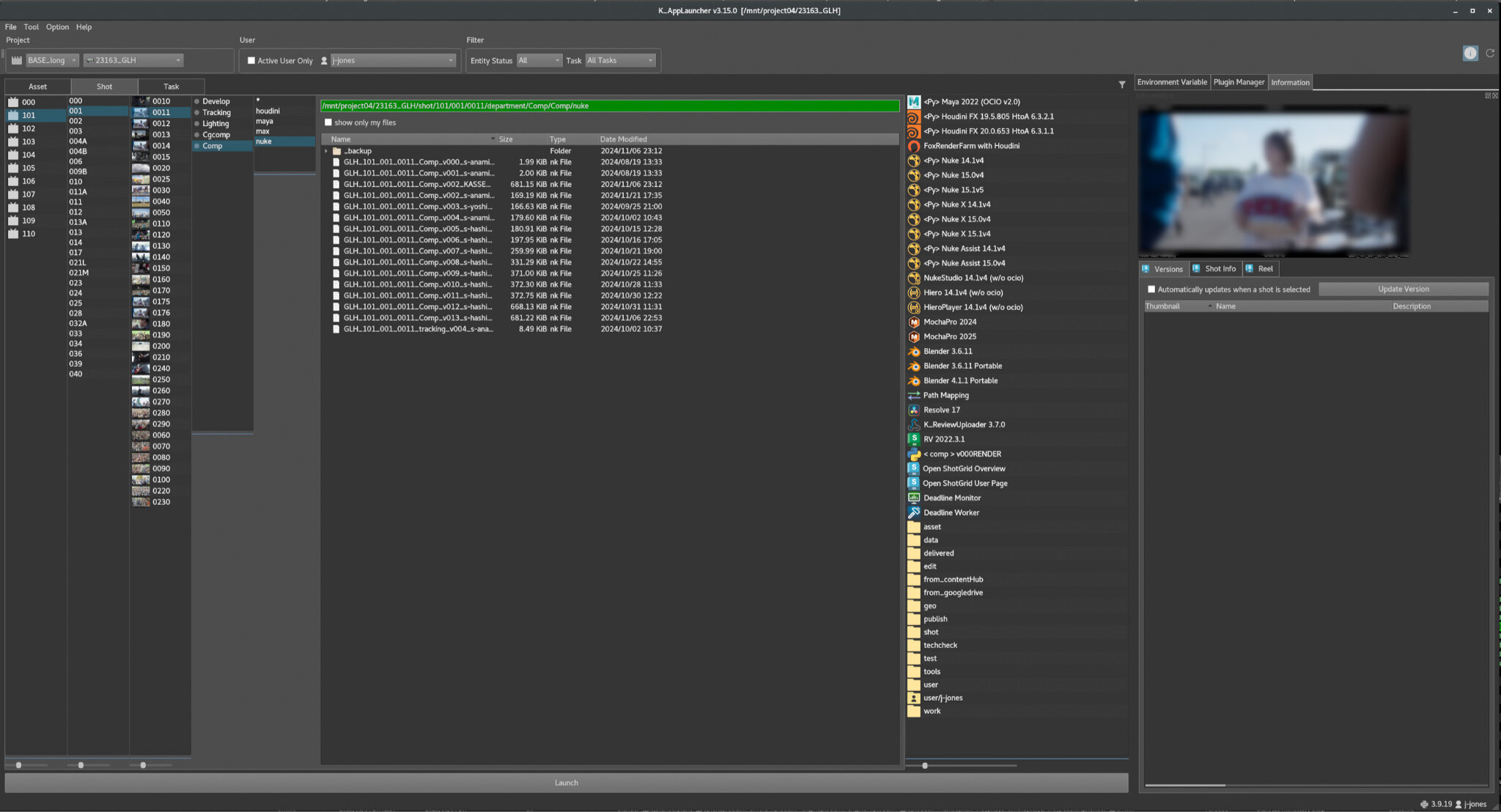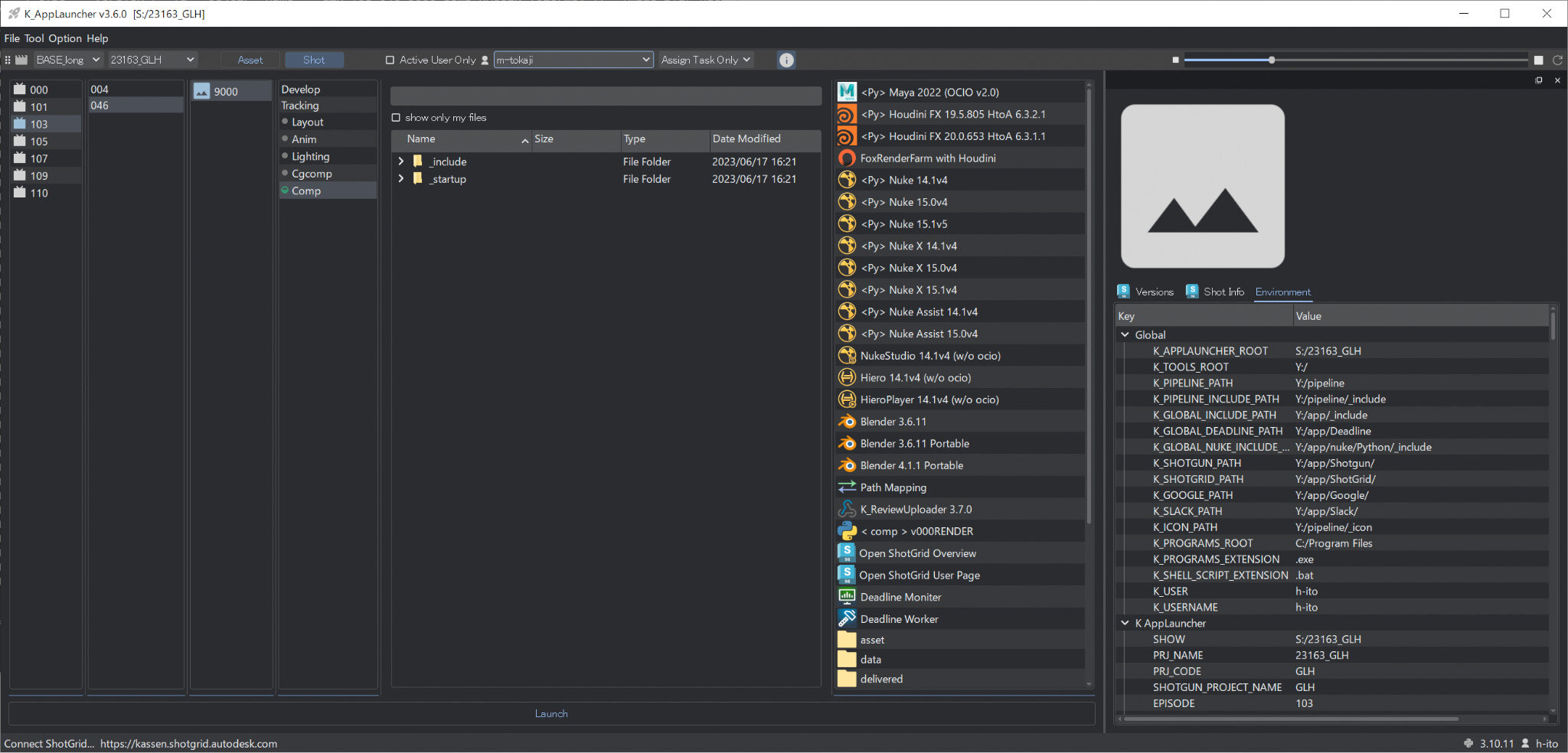 ここからはVFXワークについて具体的に解説する。まずは、KASSENのパイプラインとネットワーク環境を紹介しよう。KASSENでは、「K_AppLauncher」というアプリケーションランチャーを2022年から開発・運用している。このツールはFlow Production Tracking(以下、Flow PT)上のShotやTaskの情報を取得して、任意のDCCツールで作業を行いたいShotとTaskを選択すると、関連するディレクトリに配置されたシーンファイルを開くことができる。