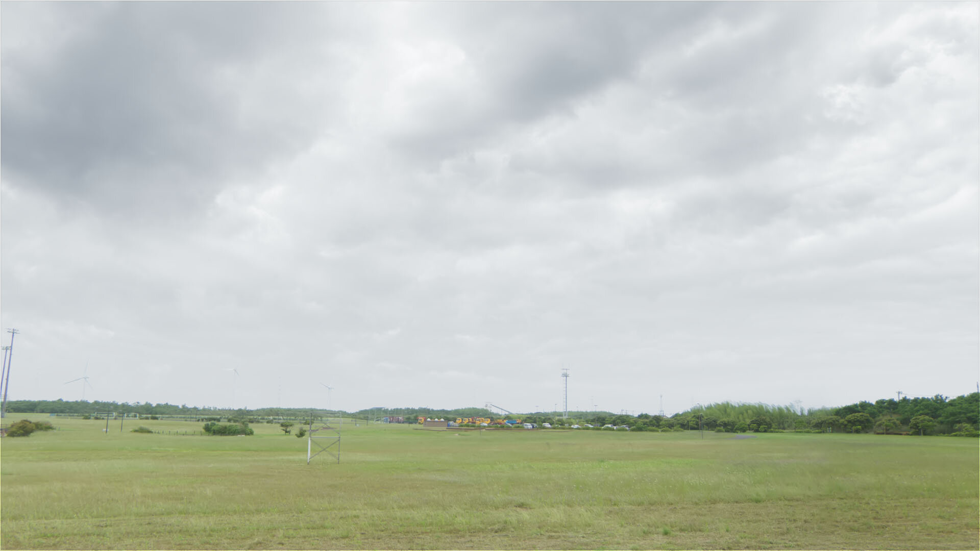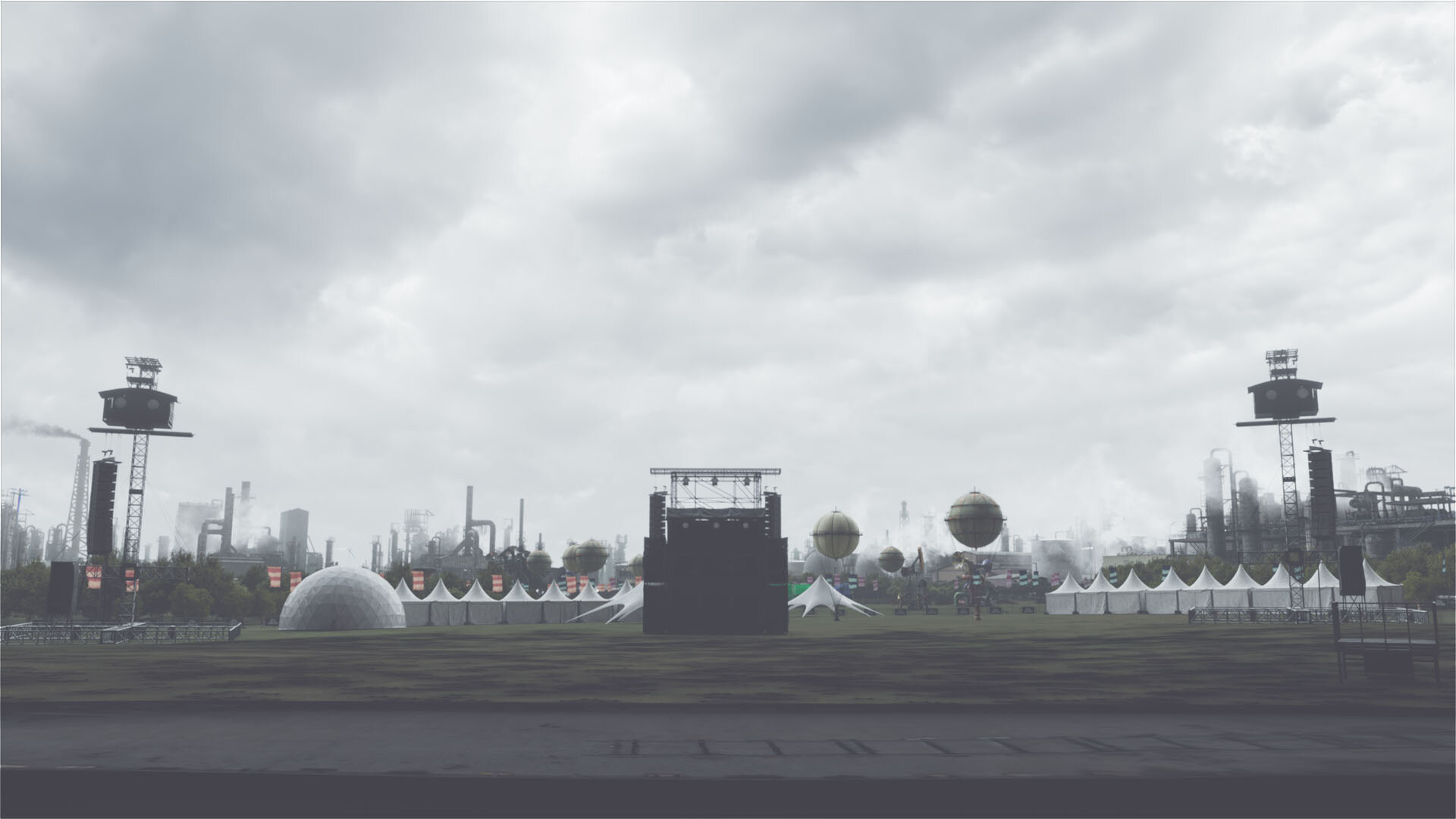 ▲<STEP 2>フェス開催地に設定された神栖総合公園の背景を合成。「Nukeにショット用のカメラを読み込めば、適した背景がレンダリングされるようにアセットが組まれています」(田向宏己氏)。このショットの完成形では背景は隠れるのだが、大半のショットではこの背景の設置からコンポジット作業が行われたそうだ