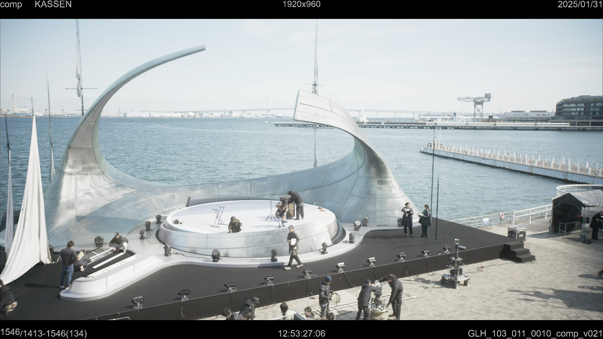 「VFXショット数は全10話で1,072に達しました。仕上げ解像度は4K(3,840×2,160)、HDR納品になります。特に最終話はほぼ全編が10万人規模の野外ライブのシーンで構成されるため、作業負荷は非常に大きなものでした。さらにKASSENにとっては、初めてヘッドスタジオを務めたシリーズ作品ということでも意義深いプロジェクトになりました」(吉川辰平VFXスーパーバイザー)。様々なチャレンジが実践されたわけだ。