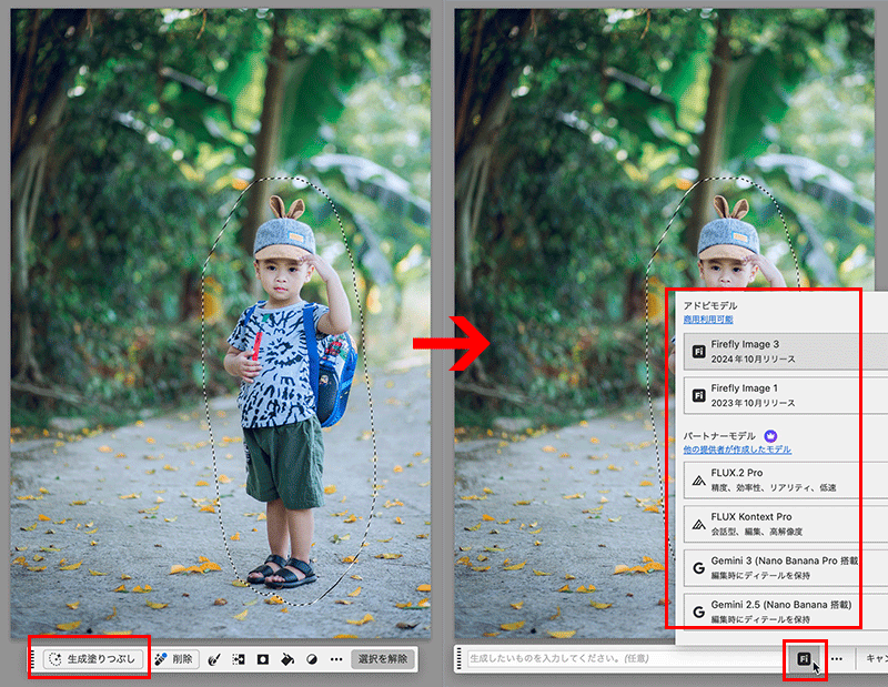 まず、このブログの執筆時点(2026年1月)で、Photoshop内で使用できる生成AIモデルは以下の通りです。その機能を実行する前に、コンテキストタスクバーなどから、どの生成AIモデルを使用するかをそれぞれ選択し、実行します。