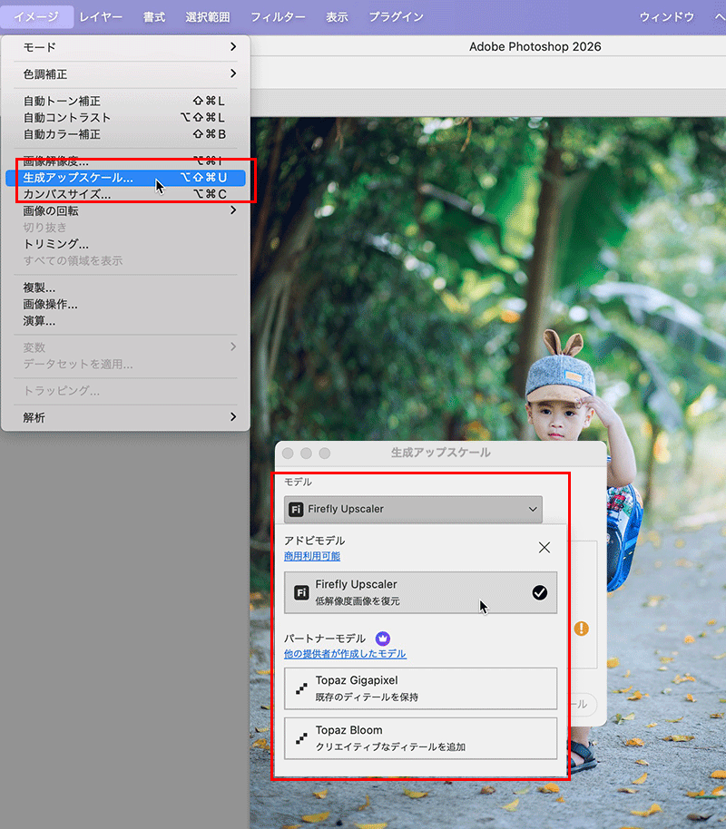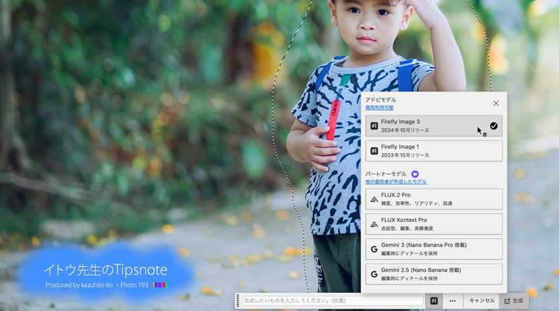 2026年最初のブログは、Photoshop 2026から新機能で、「AIパートナーモデルの選択」についてご紹介します。これまで、生成AI関連機能を使用する際はAdobe Fireflyモデルの生成AIモデルを使用していましたが、2026バージョンからは、Adobe Fireflyモデルに加え、GoogleのGemini、Black Forest LabsのFLUXなど、ほかの生成AIモデルをパートナーモデルとし、これらの生成AIモデルからお好みの生成AIモデルを選択して生成AI機能を使用する、ということができるようになりました。