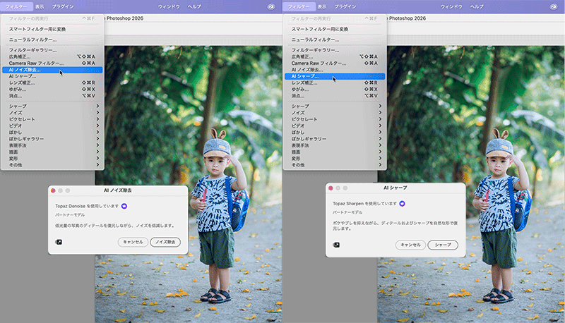 ◯フィルターメニュー>AIノイズ除去、およびAIシャープ