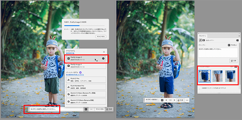 特定の生成AIモデルでは思うような仕上がりにならなかった画像も、ほかの生成AIモデルと比較検討しながら使用できるようになったため、編集内容に応じて生成AIを使い分ける、ということが可能になっています。