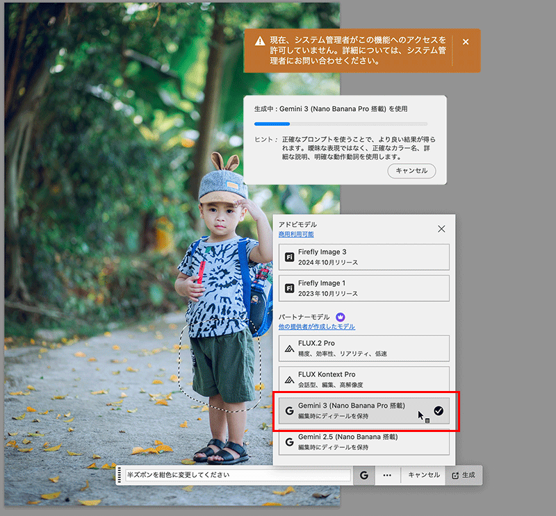 なお、Firefly以外の生成AIモデルを使用する際、社内の規約などで使用が制限されている場合もあります。その場合には以下のようなアラートを返すしてくるため、システム管理者に相談すると良いでしょう。