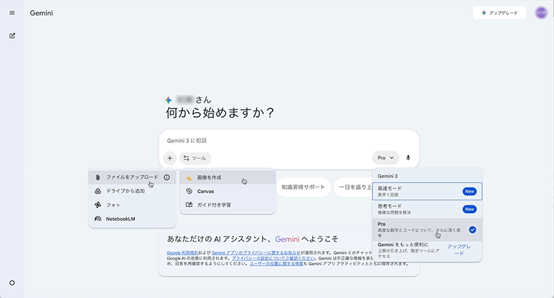 ウインドウの右下にあるマイクのアイコンの左にあるメニューから[Pro]を選択し、ツールの箇所から[画像を作成]を選択、[+]のアイコンから[ファイルをアップロード]を選択します。