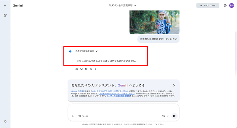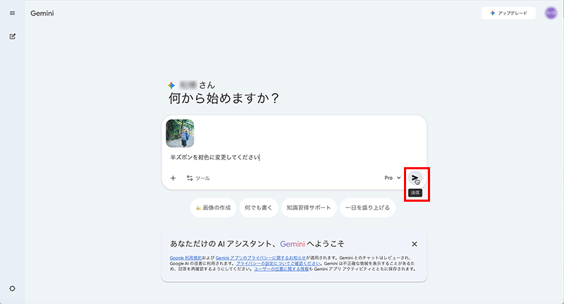 Gemini 3(Nano Banana Pro)では、Photoshopのように選択範囲を作成するツールはなく、選択範囲そのものは作成できないため、すべてプロンプトで指示する必要があります。画像のアップロード後、Photoshopで入力したプロンプトと同じプロンプトを入力し、ウインドウの右下にある[>]送信ボタンをクリックします。