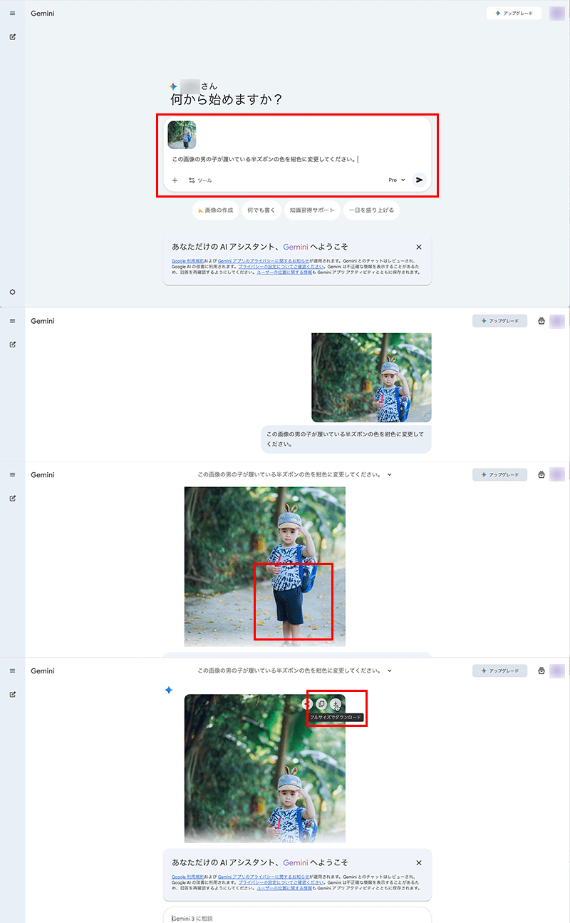 プロンプトを「この画像の男の子が履いている半ズボンの色を紺色に変更してください。」に変更し再実行すると、問題なく実行されました。実行後、この画像は、画像の右上にあるボタンからダウンロード可能です。