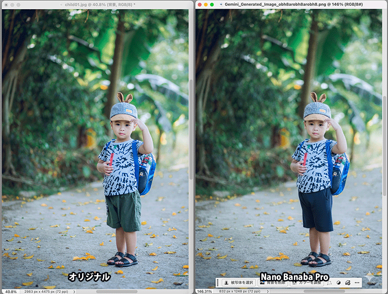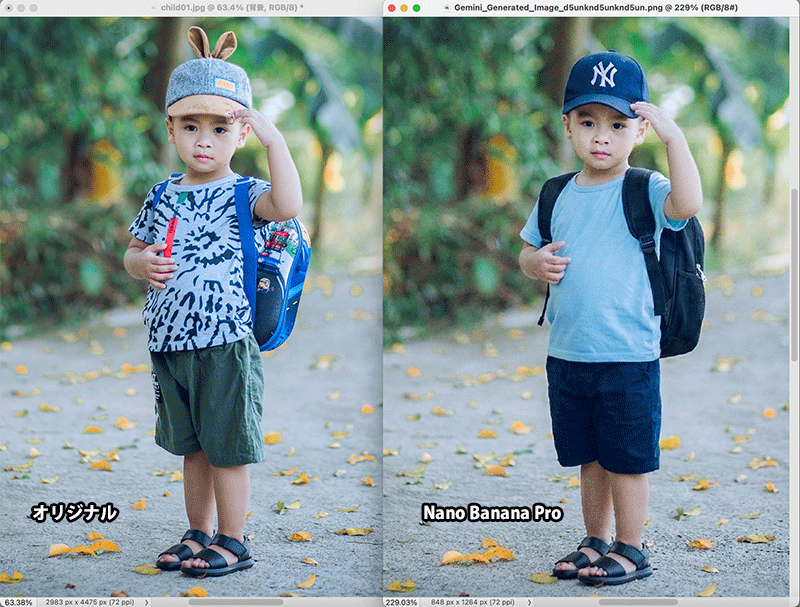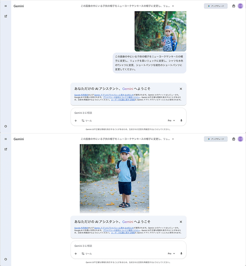 ちなみに、Gemini 3(Nano Banana Pro)に、「この画像の中にいる子供の帽子をニューヨークヤンキースの帽子に変更し、リュックを黒いリュックに変更し、シャツを水色のTシャツに変更、ショートパンツを紺色のショートパンツに変更してください。」と入力したところ、以下のようになりました。