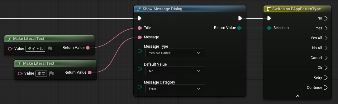 ボタンの種類による処理の分岐は、出力ピンの[Return Value]からタイプを取得できるので、Switchノードで分岐することで可能です。
