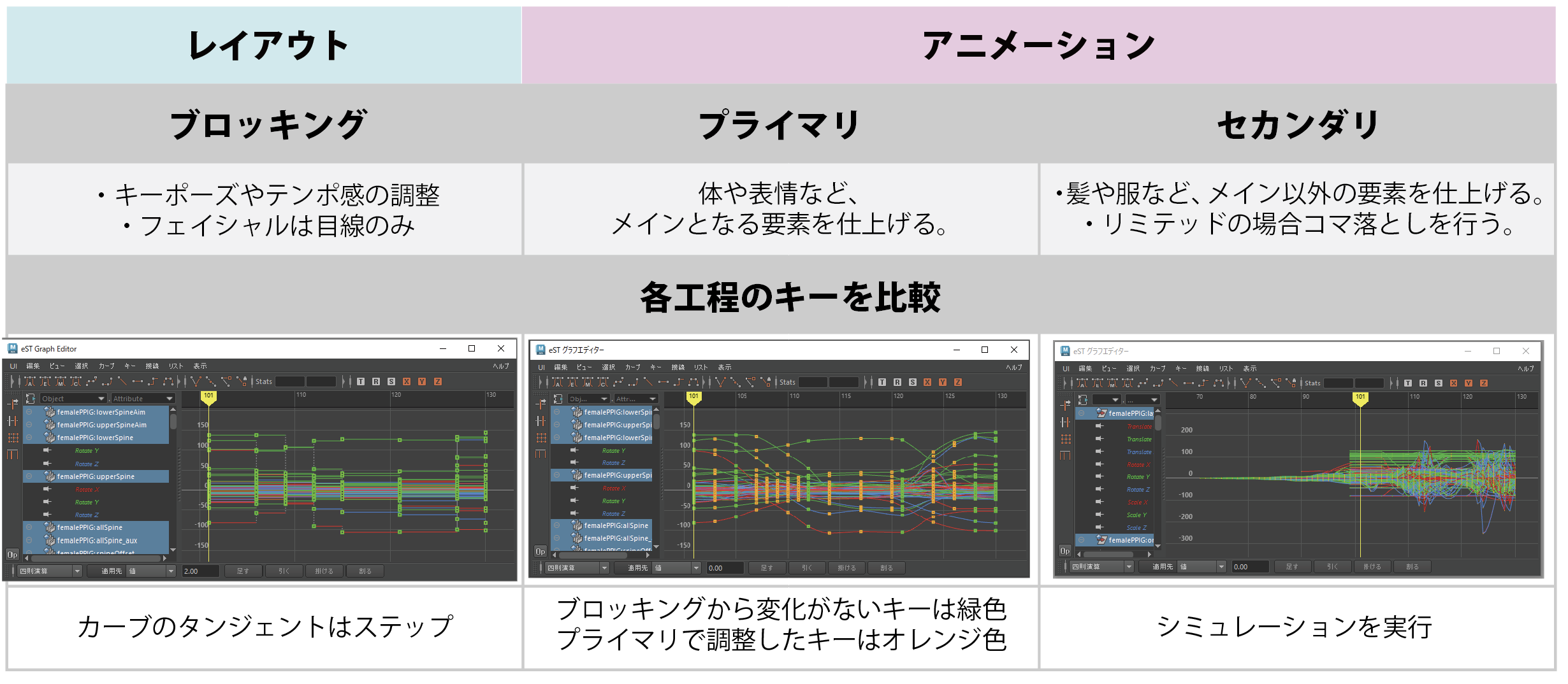 レイアウト工程でカメラと演技プランを決め、アニメーション工程で動き(モーション)を完成させるながれです。ここでは、eST機能を使った制作の進め方についてご紹介します。