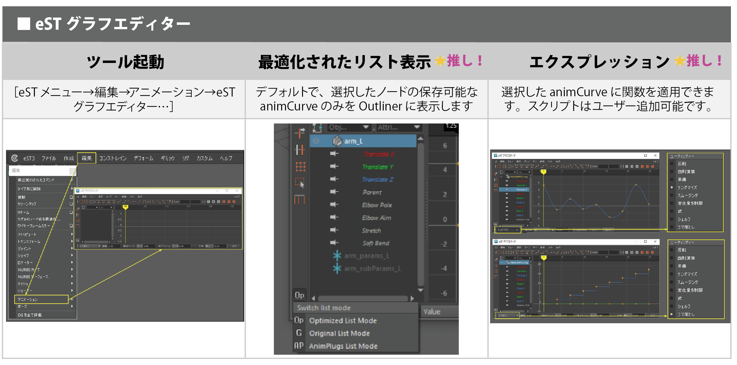 カーブの調整は「eST グラフエディター」で行います。Mayaに標準装備されている機能に加え、効率的な作業を支援する各種機能を備えています。