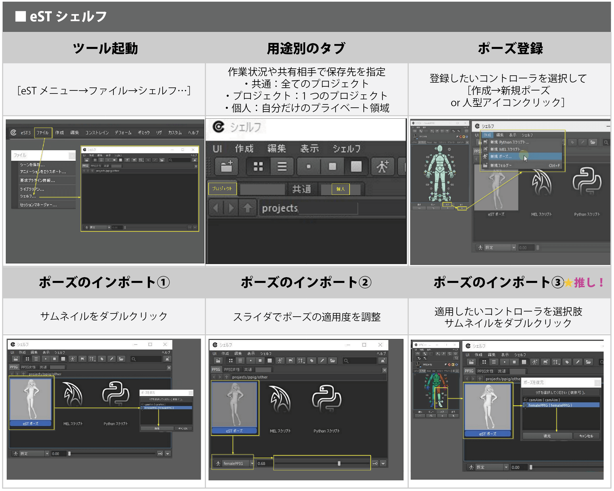 シェルフボタンを共有するためのGUIです。eSTポーズとスクリプトを扱い、フォルダを作成して整理できます。ファイル形式は異なりますが、Maya のシェルフボタンと同様に扱うことができます。