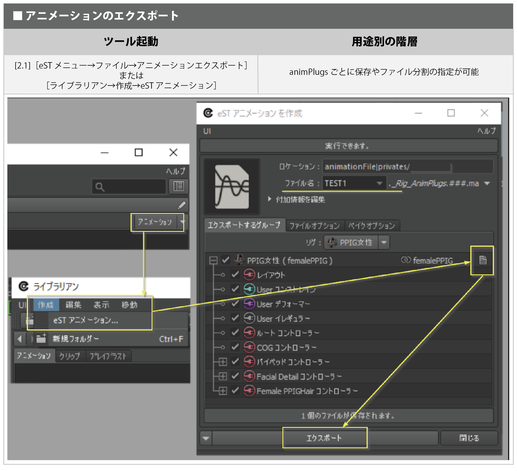 リグビューから作成されたコンストレインやデフォーマは、ベイクすることなくアニメーションファイルに保存できます。eST のアニメーションファイルは mayaAscii 形式で保存されるため、Maya のファイルメニューから読み込みやリファレンスが可能です。