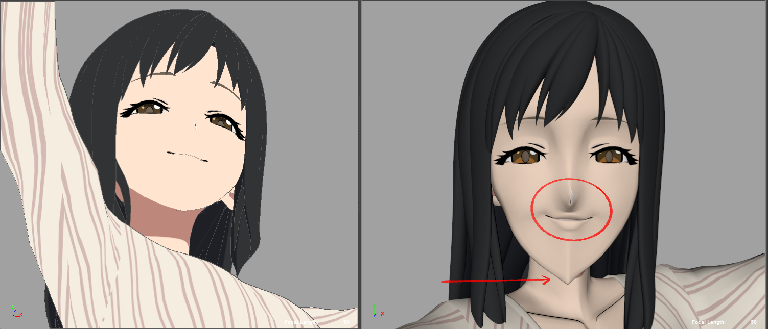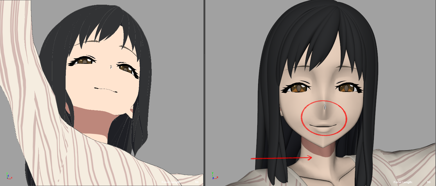 セル調表現において、アオリの構図では輪郭や顔のパーツに破綻が生じてしまいます。その場合、カメラからの見た目を優先した形状補正を行います。