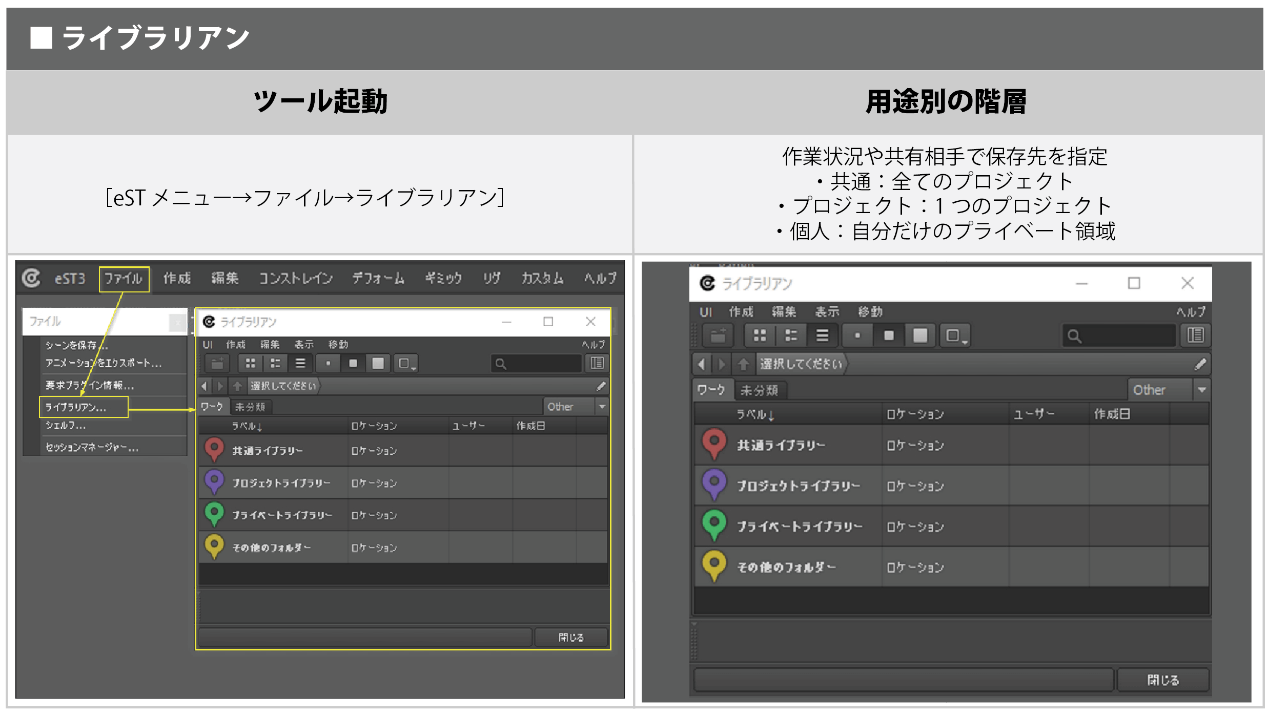汎用性のあるデータはeST3の「ライブラリアン」で管理しています。これにより、制作チーム全体で一貫した品質と、高い作業効率の確保を両立することができます。