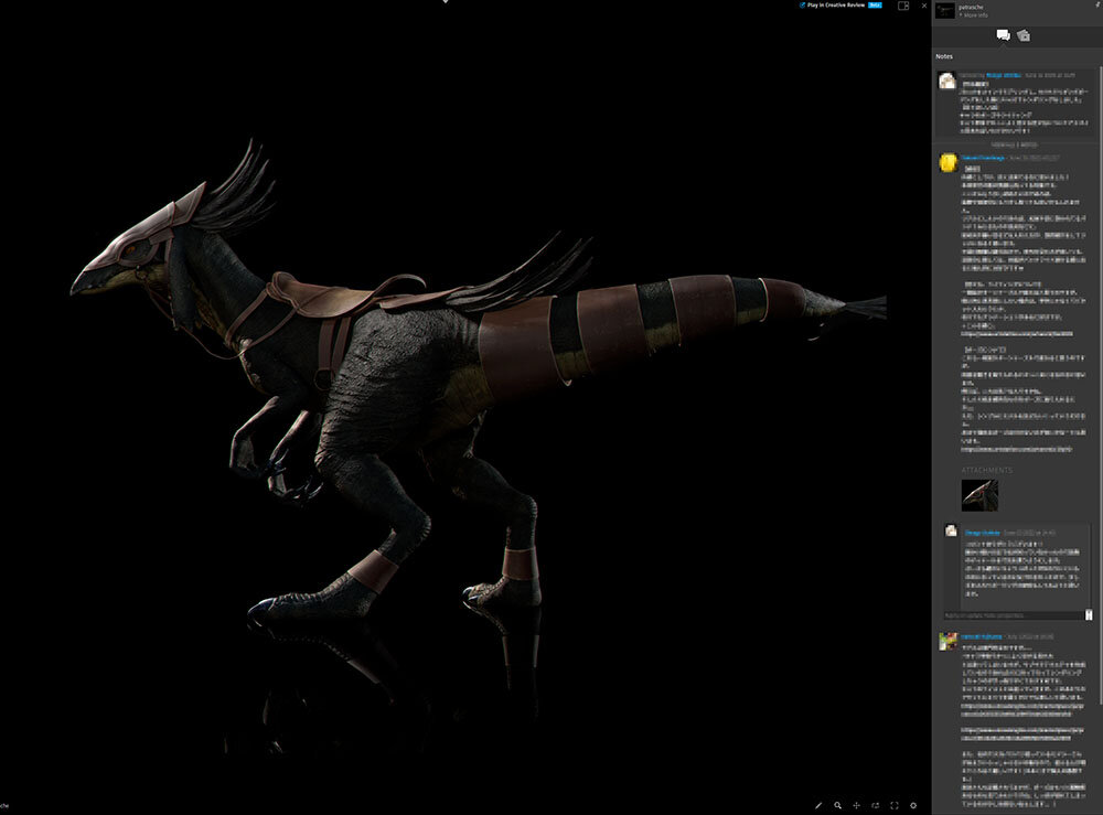 DML内で行われている「作品添削会」では、Flow PT上に投稿された新人や若手スタッフの個人制作に対し、モデリング、アニメーション、ライティングなどの複数セクションの先輩がコメントを返す。投稿者は寄せられたアドバイスを受けて再調整し、再び投稿するというサイクルが生まれる。添削会では“質問の仕方”も重要で、曖昧に「どうでしょう?」と投げると、各分野から多方向のコメントが飛んでくることもある。そうした状況を通じて、質問内容を整理し、意図を言語化する力が自然と鍛えられていく。