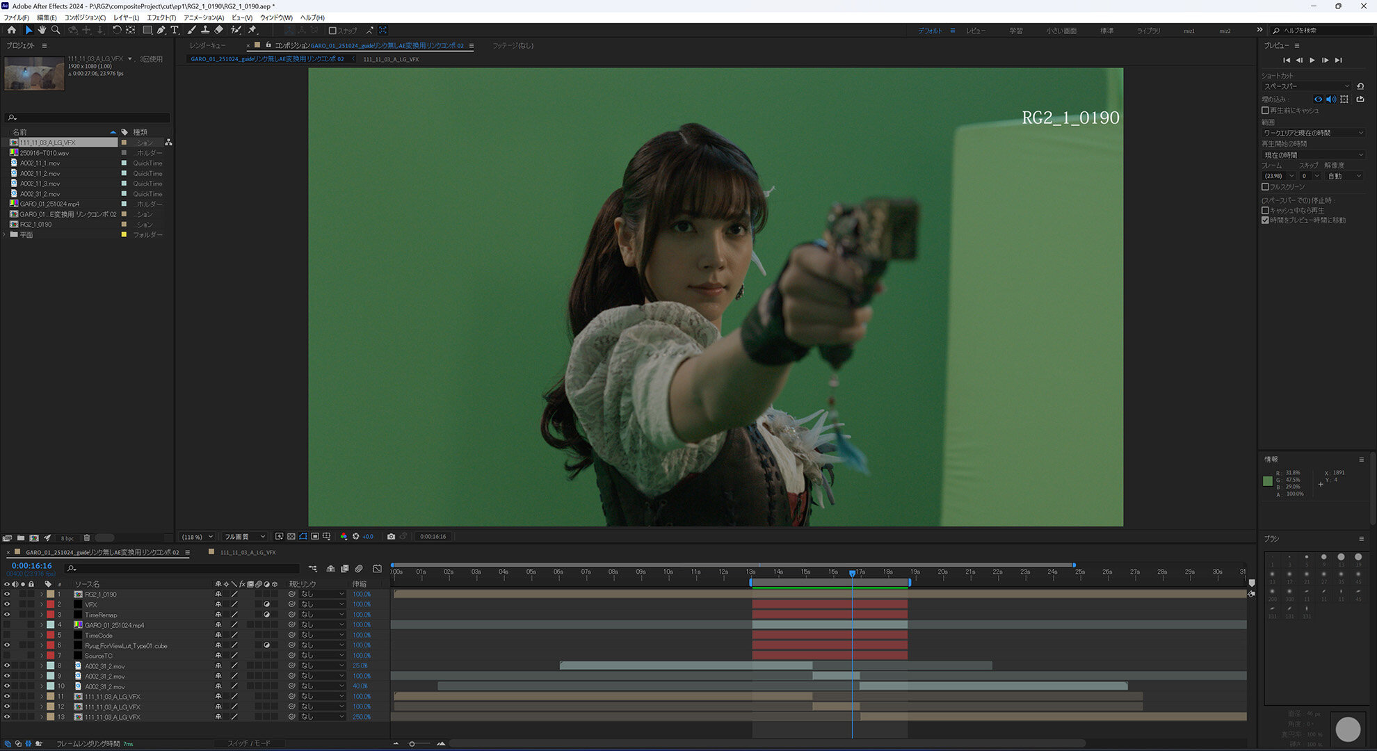 「編集を担当されているジェイ・フィルムさんがPremiere Proのマルチトラック編集機能を使って、Ki Proで収録したリアルタイム合成、フォアグラウンド(GB素材)、バッググラウンド(CG素材)を一元管理されていたので、こちらではDynamic Linkを使ってPremiereのシークエンス情報をAfter Effectsに持ち込むことで読み込み/書き出しの手間を減らしつつ、編集作業とVFX作業をシームレスに連携させることができました」(鹿角氏)。